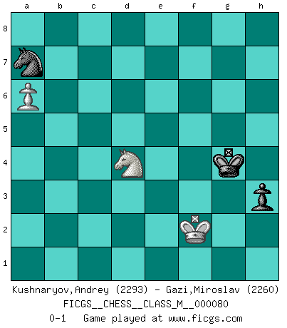Last move : 0-1 2020 January 10 3:46:52 [Event "FICGS__CHESS__CLASS_M__000080"] [Site "FICGS"] [Date "2018.08.03"] [Round "1"] [White "Kushnaryov,Andrey"] [Black "Gazi,Miroslav"] [Result "0-1"] [WhiteElo "2293"] [BlackElo "2260"] 1.d4 Nf6 2.c4 e6 3.Nf3 d5 4.g3 Be7 5.Bg2 O-O 6.O-O dxc4 7.Qc2 a6 8.a4 Bd7 9.Qxc4 Bc6 10.Bg5 a5 11.Nc3 Na6 12.e3 Nb4 13.Rfd1 Nd7 14.Bxe7 Qxe7 15.Nd2 Bxg2 16.Kxg2 c5 17.Nf3 cxd4 18.Nxd4 Rfd8 19.Qc7 b6 20.Nc6 Qc5 21.Rxd7 Rxd7 22.Qxd7 Qxc6+ 23.Qxc6 Nxc6 24.Rd1 Ne5 25.b3 Kf8 26.Nb5 Ke7 27.Rd6 Rb8 28.f4 Ng4 29.e4 Rc8 30.e5 Rc2+ 31.Kf3 Nxh2+ 32.Ke4 Nf1 33.g4 Rd2 34.Rxb6 Ng3+ 35.Ke3 Nf1+ 36.Kf3 f5 37.exf6+ gxf6 38.f5 exf5 39.gxf5 h5 40.Re6+ Kf7 41.Nd6+ Kg7 42.Ne8+ Kh6 43.Nxf6 Kg5 44.Ne8 Kxf5 45.Rh6 Kg5 46.Rc6 Rb2 47.Rc5+ Kg6 48.Rxa5 Rxb3+ 49.Kf4 Rb4+ 50.Kf3 h4 51.Ra6+ Kg5 52.Ra5+ Kh6 53.Kg2 Nd2 54.Ra6+ Kg5 55.Ra5+ Kf4 56.Nf6 Rd4 57.Rd5 Nf3 58.Rxd4+ Nxd4 59.Kf2 Nc6 60.Nh5+ Kg5 61.Ng7 Nd4 62.Ne8 Kg4 63.Kg2 Nc6 64.Kh2 Nd4 65.a5 Nb5 66.a6 Na7 67.Ng7 Nc8 68.Kg2 Na7 69.Ne6 Nb5 70.Nd4 Na7 71.Nc2 Kg5 72.Nd4 Kg4 73.Kf2 h3 0-1 Queen's pawn game Kingside Castling by player Black (move 5) Kingside Castling by player White (move 6) 10 pieces endgame at move 44 : White KRNPP , Black KRNPP WHITE : King + 1 Rook 1 Knight 2 Pawns BLACK : King + 1 Rook 1 Knight 2 Pawns 9 pieces endgame at move 48 : White KRNPP , Black KRNP WHITE : King + 1 Rook 1 Knight 2 Pawns BLACK : King + 1 Rook 1 Knight 1 Pawn 8 pieces endgame at move 48 : White KRNP , Black KRNP WHITE : King + 1 Rook 1 Knight 1 Pawn BLACK : King + 1 Rook 1 Knight 1 Pawn 7 pieces endgame at move 58 : White KRNP , Black KNP WHITE : King + 1 Rook 1 Knight 1 Pawn BLACK : King + 1 Knight 1 Pawn 6 pieces endgame at move 58 : White KNP , Black KNP WHITE : King + 1 Knight 1 Pawn BLACK : King + 1 Knight 1 Pawn Player Black won this chess game. Follow this game move after move (download)On the chessboard, lies and hypocrisy do not survive long. (Emanuel Lasker) Wir können eben der zündenden Macht des Opfers nicht wiederstehen, denn die Begeisterung für das Opfer liegt in der Natur des Menschen. (Rudolf Spielmann) Cualquier cambio de material en una posición debe venir por medio de un mate, una captura o promoción de Peón. (Purdy) À la honte des hommes, on sait que les lois du jeu sont les seules qui soient partout justes, claires, inviolables et exécutées. Pourquoi l'Indien qui a donné les règles du jeu d'échecs est-il obéi de bon gré dans toute la terre, et que les décrétales des papes, par exemple, sont aujourd'hui un objet d'horreur et de mépris ? C'est que l'inventeur des échecs combina tout avec justesse pour la satisfaction des joueurs, et que les papes, dans leurs décrétales, n'eurent en vue que leur seul avantage. L'Indien voulut exercer également l'esprit des hommes et leur donner du plaisir; les papes ont voulu abrutir l'esprit des hommes. Voltaire (Dictionnaire philosophique / Garnier 1967) Without enthusiasm, virtue functions not at all, and vice only poorly. (Mignon McLaughlin, The Neurotic's Notebook, 1960)