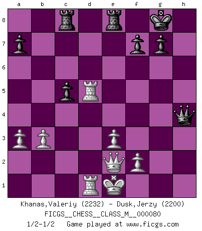 Last move : 1/2-1/2 2018 September 12 10:27:5 [Event "FICGS__CHESS__CLASS_M__000080"] [Site "FICGS"] [Date "2018.08.03"] [Round "1"] [White "Khanas,Valeriy"] [Black "Dusk,Jerzy"] [Result "1/2-1/2"] [WhiteElo "2232"] [BlackElo "2200"] 1.d4 Nf6 2.c4 e6 3.Nf3 d5 4.g3 Bb4+ 5.Bd2 Be7 6.Bg2 O-O 7.O-O Nbd7 8.Qc2 c6 9.Bf4 b6 10.Rd1 Bb7 11.Ne5 Nh5 12.Bd2 Nhf6 13.cxd5 cxd5 14.Nc6 Bxc6 15.Qxc6 Rc8 16.Qb5 Ne8 17.Qa6 Nb8 18.Qd3 Nc6 19.Nc3 Nb4 20.Qb1 Qd7 21.a3 Nc6 22.e3 Na5 23.b3 h5 24.Bf1 h4 25.Ba6 Rb8 26.Ne2 Nc6 27.Qa2 Nc7 28.Bd3 e5 29.dxe5 Nxe5 30.Bc3 Nxd3 31.Rxd3 Rbc8 32.Rad1 Qf5 33.Nd4 Qg6 34.Bb4 Bc5 35.Bxc5 bxc5 36.Ne2 Rfe8 37.Nf4 Qf5 38.Nxd5 Nxd5 39.Rxd5 Qf3 40.gxh4 Qg4+ 41.Kf1 Qh3+ 42.Ke1 Qxh2 43.Qd2 Qxh4 44.Qe2 1/2-1/2 Queen's pawn game Kingside Castling by player Black (move 6) Kingside Castling by player White (move 7) This chess game ended in a draw. Follow this game move after move (download)Is Bobby Fischer quite sane ? (Salo Flohr) Immer nach dem besten Zug zu suchen ist ziemlich unpraktisch. (Nigel Short) El Ajedrez tiene tanto misterio como las mujeres. (Purdy) La victoire dans une partie d'Echecs appartient la plupart du temps à celui qui voit un peu plus loin que l'adversaire. (Lasker) Luck never made a man wise. (Seneca, Letters to Lucilius)