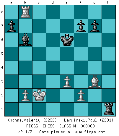 Last move : 1/2-1/2 2018 September 1 15:37:59 [Event "FICGS__CHESS__CLASS_M__000080"] [Site "FICGS"] [Date "2018.08.03"] [Round "1"] [White "Khanas,Valeriy"] [Black "Larwinski,Paul"] [Result "1/2-1/2"] [WhiteElo "2232"] [BlackElo "2291"] 1.d4 d5 2.c4 e6 3.Nc3 Be7 4.cxd5 exd5 5.Bf4 c6 6.e3 Bf5 7.g4 Be6 8.h3 Nd7 9.Qc2 h5 10.gxh5 Rxh5 11.Be2 Rh8 12.O-O-O Ngf6 13.Nf3 Ne4 14.Nxe4 dxe4 15.Nd2 Bxa2 16.Nxe4 Qa5 17.Nc3 Be6 18.Bg4 Bc4 19.Bxd7+ Kxd7 20.d5 cxd5 21.Nxd5 Qa1+ 22.Qb1 Qxb1+ 23.Kxb1 Bxd5 24.Rxd5+ Ke8 25.Rc1 Rd8 26.Rxd8+ Bxd8 27.Rc8 Kd7 28.Rb8 Rxh3 29.Rxb7+ Ke6 30.Bg3 Bb6 31.Rb8 Rh1+ 32.Kc2 1/2-1/2 QGD : Charousek (Petrosian) variation Queenside Castling by player White (move 12) This chess game ended in a draw. Follow this game move after move (download)I thought the most common mistake [in chess] was the first one: Learning the game :P (Garvin Gray, FICGS forum) Als er Schachweltmeister wurde ließ er praktisch alle stärksten Sovietspieler für sich arbeiten. Wenn ein auch nur mittelmässiger Meister ein Spezialist für eine bestimmte Eröffnung war, wurde er von Karpov gerufen. Das wurde alles geheim gehalten. (Mikhail Moiseyevich Botvinik) Desconfianza es la característica mas necesaria de un jugador de Ajedrez. (Siegbert Tarrasch) L'action d'une oeuvre littéraire se déroule sur un champ de bataille. Les masques et les types du drame moderne correspondent aux pièces du jeu d'échecs. L'intrigue correspond aux coups et aux gambits, c'est à dire aux techniques du jeu telles qu'utilisées et interprétées par les joueurs. Les tactiques et les péripéties [mouvements] correspondent aux coups exécutés par l'adversaire. (Viktor Shklovsky) An expert is a man who has made all the mistakes which can be made in a very narrow field. (Niels Bohr)