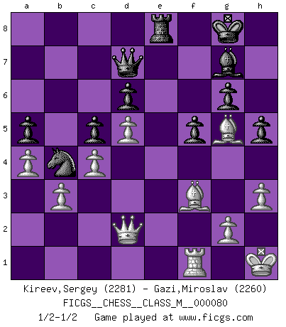 Last move : 1/2-1/2 2018 August 27 11:40:26 [Event "FICGS__CHESS__CLASS_M__000080"] [Site "FICGS"] [Date "2018.08.03"] [Round "1"] [White "Kireev,Sergey"] [Black "Gazi,Miroslav"] [Result "1/2-1/2"] [WhiteElo "2281"] [BlackElo "2260"] 1.e4 c5 2.Nf3 d6 3.d4 cxd4 4.Nxd4 Nf6 5.Nc3 a6 6.Be3 e5 7.Nb3 Be6 8.f3 h5 9.Nd5 Bxd5 10.exd5 Nbd7 11.Qd2 g6 12.Be2 Bg7 13.O-O b6 14.h3 O-O 15.a4 Re8 16.Rab1 Qc7 17.c3 Qb7 18.c4 a5 19.Kh1 Nc5 20.Nxc5 bxc5 21.b3 Qe7 22.Rbe1 e4 23.Bd1 exf3 24.Bxf3 Qb7 25.Qc2 Nd7 26.Bd1 Ne5 27.Bf4 Qd7 28.Bg5 f5 29.Qf2 Nd3 30.Rxe8+ Rxe8 31.Qd2 Nb4 32.Bf3 1/2-1/2 Sicilian : Najdorf, Byrne (English) attack Kingside Castling by player White (move 13) Kingside Castling by player Black (move 14) This chess game ended in a draw. Follow this game move after move (download)A man that will take back a move at Chess will pick a pocket. (Richard Fenton) Schach ist ein Reich, wo sich die menschliche Phantasie frei entfalten kann. (David Bronstein) La última cosa en que Fischer estaba interesado era en tonterías, siempre y cuando el Ajedrez estuviera involucrado. (Elie Agur) Echiquier : carré parfait, comme la Jérusalem nouvelle décrite par l'auteur de l'Apocalypse, huit cases sur huit, exaltation du chiffre 4, symbole du cosmos aux quatre horizons... où le noir et le blanc, l'ombre et la lumière, le mal et le bien s'entremêlent et se conjuguent. (Robert Couffignal, Le Gambit du poète) Pushing plastic is for the many, pushing virtual pieces is for the fewer, pushing wood is for the very few. (Normajean Yates)