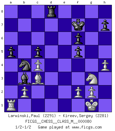 Last move : 1/2-1/2 2018 August 11 10:36:54 [Event "FICGS__CHESS__CLASS_M__000080"] [Site "FICGS"] [Date "2018.08.03"] [Round "1"] [White "Larwinski,Paul"] [Black "Kireev,Sergey"] [Result "1/2-1/2"] [WhiteElo "2291"] [BlackElo "2281"] 1.e4 e5 2.Nf3 Nc6 3.Bb5 a6 4.Ba4 Nf6 5.O-O Be7 6.Re1 b5 7.Bb3 O-O 8.h3 Bb7 9.d3 d5 10.exd5 Nxd5 11.Nxe5 Nd4 12.Nc3 Nb4 13.Ne4 Nxb3 14.axb3 Qd5 15.Bf4 Rae8 16.Qd2 c5 17.Rad1 f5 18.c4 bxc4 19.bxc4 Qd4 20.Nc3 Bf6 21.Ne2 Qd8 22.d4 a5 23.h4 Be4 24.Ng3 Bc2 25.Rc1 Qxd4 26.Nd7 Rxe1+ 27.Rxe1 Qxd2 28.Bxd2 Rd8 29.Nxf6+ gxf6 30.Bc3 Kf7 31.Rc1 Bb3 32.Ra1 1/2-1/2 Ruy Lopez : Closed, 7...O-O Kingside Castling by player White (move 5) Kingside Castling by player Black (move 7) This chess game ended in a draw. Follow this game move after move (download)Avoid the crowd. Do your own thinking independently. Be the Chess player, not the Chess piece. (Ralph Charell) Eine Person mit durchschnittlichem IQ kann etwa eine ELO von 2000 erreichen. (Jonathan Levitt) No es suficiente ser un buen jugador, se debe también de jugar bién. (Siegbert Tarrasch) Demandez au pauvre Cg1 ce qu'il en pense. Eduard Gufeld à propos de la variante Saemisch de l'Est-Indienne. I don't believe in psychology. I believe in good moves. (Bobby Fischer)