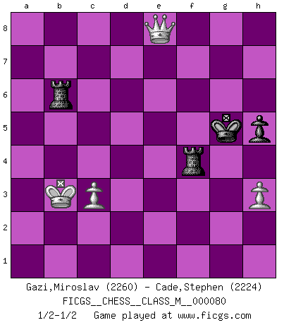Last move : 1/2-1/2 2019 June 7 16:31:24 [Event "FICGS__CHESS__CLASS_M__000080"] [Site "FICGS"] [Date "2018.08.03"] [Round "1"] [White "Gazi,Miroslav"] [Black "Cade,Stephen"] [Result "1/2-1/2"] [WhiteElo "2260"] [BlackElo "2224"] 1.Nf3 Nf6 2.c4 g6 3.Nc3 Bg7 4.e4 d6 5.d4 O-O 6.h3 e5 7.d5 Nh5 8.g3 f5 9.exf5 gxf5 10.Nh4 Nf6 11.Bg5 Na6 12.Qc2 Nb4 13.Qb1 Qe8 14.a3 Na6 15.Qc2 Nc5 16.Be3 Bd7 17.Be2 c6 18.g4 cxd5 19.cxd5 Rc8 20.Nxf5 Bxf5 21.gxf5 Nce4 22.Qd3 Nxc3 23.bxc3 Kh8 24.Rg1 e4 25.Qd4 Qe7 26.O-O-O Ne8 27.Rxg7 Nxg7 28.Bg4 Rc7 29.Kb2 b6 30.Bh6 Qf6 31.Qd2 Rc5 32.Bg5 Qe5 33.f6 Nf5 34.Bf4 Qxf6 35.Bxf5 Rc4 36.Kb3 b5 37.Bh2 Qxf5 38.Bxd6 Rf7 39.Bc5 Kg8 40.Qe3 Rd7 41.Rg1+ Kf7 42.Rg4 Rxc5 43.Rf4 R7xd5 44.Qxe4 Qxf4 45.Qxf4+ Rf5 46.Qb8 a5 47.Qa7+ Kg6 48.Qxa5 Rc4 49.Qd8 Rfc5 50.Qg8+ Kf6 51.Kb2 h5 52.Qf8+ Kg6 53.Qd6+ Kg5 54.Qd3 Rf5 55.Qe3+ Kf6 56.Kb3 Rcf4 57.Qb6+ Kg5 58.Qd8+ Kg6 59.Qc7 Rxf2 60.Qb6+ Kg5 61.Qd4 R2f4 62.Qd8+ Rf6 63.Qe8 R4f5 64.a4 bxa4+ 65.Qxa4 Rf4 66.Qe8 Rb6+ 1/2-1/2 Reti Opening Kingside Castling by player Black (move 5) Queenside Castling by player White (move 26) 10 pieces endgame at move 59 : White KQPPP , Black KRRPP WHITE : King + 1 Queen 3 Pawns BLACK : King + 2 Rooks 2 Pawns 9 pieces endgame at move 64 : White KQPP , Black KRRPP WHITE : King + 1 Queen 2 Pawns BLACK : King + 2 Rooks 2 Pawns 8 pieces endgame at move 65 : White KQPP , Black KRRP WHITE : King + 1 Queen 2 Pawns BLACK : King + 2 Rooks 1 Pawn This chess game ended in a draw. Follow this game move after move (download)Excellence at Chess is one mark of a scheming mind. (Sir Arthur Conan Doyle) Wenn ein Kopf und ein Buch zusammenstoßen und es klingt hohl, ist es denn allemal im Buche? (Georg Christoph Lichtenberg) El Ajedrez es el arte del análisis. (Mikhail Botvinnik) Pour se monter efficace, un Cavalier a besoin d'avant-postes ! Les Cavaliers font les meilleurs bloqueurs de pions passés. The large trees attract high winds. (Chinese proverb)