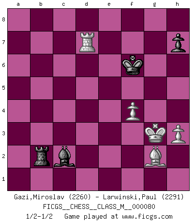 Last move : 1/2-1/2 2018 October 3 14:56:22 [Event "FICGS__CHESS__CLASS_M__000080"] [Site "FICGS"] [Date "2018.08.03"] [Round "1"] [White "Gazi,Miroslav"] [Black "Larwinski,Paul"] [Result "1/2-1/2"] [WhiteElo "2260"] [BlackElo "2291"] 1.Nf3 d5 2.c4 e6 3.d4 Nf6 4.g3 dxc4 5.Bg2 Nc6 6.Qa4 Bb4+ 7.Bd2 Nd5 8.Bxb4 Ndxb4 9.O-O Rb8 10.Na3 O-O 11.Qb5 b6 12.Qxc4 Ba6 13.Nb5 Qd5 14.Qxd5 Nxd5 15.a4 Na5 16.Ne5 Rbd8 17.Nxa7 Nb4 18.Rac1 Rxd4 19.Rxc7 Bxe2 20.Rfc1 f6 21.Nec6 Naxc6 22.Nxc6 Nxc6 23.R7xc6 Rfd8 24.h3 Rd1+ 25.Rxd1 Bxd1 26.Rxe6 Bxa4 27.Rxb6 Rd1+ 28.Kh2 Rd2 29.f4 g5 30.Rxf6 gxf4 31.gxf4 Rxb2 32.Kg3 Kg7 33.Rd6 Bc2 34.Rd7+ Kf6 1/2-1/2 Reti Opening Kingside Castling by player White (move 9) Kingside Castling by player Black (move 10) 10 pieces endgame at move 31 : White KRBPPP , Black KRBP WHITE : King + 1 Rook 1 Bishop 3 Pawns BLACK : King + 1 Rook 1 Bishop 1 Pawn 9 pieces endgame at move 31 : White KRBPP , Black KRBP WHITE : King + 1 Rook 1 Bishop 2 Pawns BLACK : King + 1 Rook 1 Bishop 1 Pawn This chess game ended in a draw. Follow this game move after move (download)Chess is a fighting game which is purely intellectual and includes chance. (Richard Reti) Das Spiel gibt uns die Genugtuung, die das Leben uns versagt. (Emanuel Lasker) Te sientas frente a un tablero y repentinamente tu corazón brinca. Tu mano tiembla al tomar una pieza y moverla. Pero lo que el Ajedrez te enseña es que tu debes permanecer ahí con calma y pensar de que si realmente es una buena idea o de que si hay otras ideas mejores. (Stanley Kubrick) Un footballeur joue avec ses pieds, parfois avec sa tête. Un joueur d'échecs ne joue qu'avec sa tête. Et quand il ne joue plus, il meurt. (Jacob Murray) When you stop learning you start dying. (Scott Adams)
