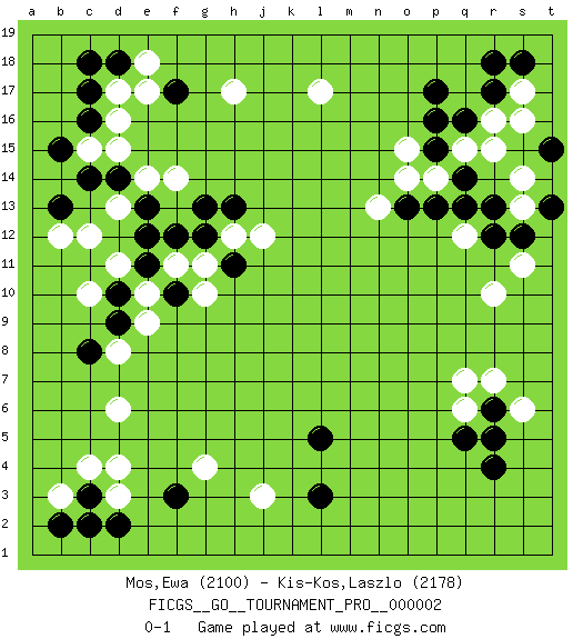Last move : 0-1 2007 September 7 1:23:1 [Event "FICGS__GO__TOURNAMENT_PRO__000002"] [Site "FICGS"] [Date "2007.05.16"] [Round "1"] [Black "Mos,Ewa"] [White "Kis-Kos,Laszlo"] [Result "0-1"] [Rating 1 "2100"] [Rating 2 "2178"] 1.q16 d4 2.r4 d16 3.f3 d6 4.l3 r10 5.r13 q6 6.r6 r7 7.q5 s6 8.r5 q7 9.f17 h17 10.c17 d17 11.c16 d15 12.d18 e18 13.c18 e17 14.c14 l17 15.p17 c12 16.d14 j3 17.l5 g4 18.c3 d3 19.d2 c4 20.b2 b3 21.c2 r15 22.q14 q15 23.p15 r16 24.r17 s17 25.r18 p14 26.p13 o14 27.o13 o15 28.p16 n13 29.s18 s13 30.s12 q12 31.q13 s14 32.r12 s16 33.t15 s11 34.t13 e14 35.e13 c15 36.b15 d13 37.b13 b12 38.e12 f14 39.d9 d11 40.e11 e10 41.d10 f11 42.f10 e9 43.f12 g11 44.g12 d8 45.c8 h12 46.h11 g10 47.h13 j12 48.g13 c10 0-1 This go game has been lost on time (started : 2007.05.16 16:49:44) Here are the names of the openings (joseki) played in the four corners : Corner d4 : d4 f3 Hoshi (Hwajeom, Seongjeom, Xingwei`) 4-4 Point. The star or hoshi (4-4) point, emphasizing influence at the potential expense of territory. Ikken Kakari (Hankan Keolch'im, Yi Gua`jiao~, 1-Space Low Approach). Black 2 is the standard approach move to the 4-4. Corner d16 : d16 f17 Hoshi (Hwajeom, Seongjeom, Xingwei`) 4-4 Point. The star or hoshi (4-4) point, emphasizing influence at the potential expense of territory. Ikken Kakari (Hankan Keolch'im, Yi Gua`jiao~, 1-Space Low Approach). Black 2 is the standard approach move to the 4-4. Player White won this Go (weiqi, baduk) game. Follow this game move after move (download)It is difficult to know exactly what you are doing. (Pierre Audouard) A good programmer is someone who always looks both ways before crossing a one-way street. (Doug Linder)