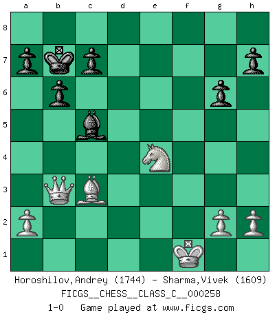 Last move : 1-0 2018 August 7 22:27:16 [Event "FICGS__CHESS__CLASS_C__000258"] [Site "FICGS"] [Date "2018.08.05"] [Round "1"] [White "Horoshilov,Andrey"] [Black "Sharma,Vivek"] [Result "1-0"] [WhiteElo "1744"] [BlackElo "1609"] 1.c4 Nf6 2.Nc3 d5 3.e3 e5 4.cxd5 Nxd5 5.Bc4 Nxc3 6.bxc3 Nc6 7.Qf3 f6 8.Qh5+ g6 9.Qd1 Bc5 10.Ne2 Bg4 11.O-O Qd7 12.d4 exd4 13.cxd4 Bd6 14.Bb2 O-O-O 15.Bc3 f5 16.Qb3 f4 17.Rab1 b6 18.f3 Rde8 19.d5 Rxe3 20.dxc6 Qxc6 21.Nd4 Qd7 22.Bb5 Qe7 23.fxg4 Qh4 24.Nf3 Qxg4 25.Rbe1 Rf8 26.Rxe3 fxe3 27.Bc4 Kb8 28.Ne5 Rxf1+ 29.Bxf1 Bc5 30.Nxg4 e2 31.Nf2 exf1Q+ 32.Kxf1 Kb7 33.Ne4 1-0 English : Anglo-Gruenfeld defense Kingside Castling by player White (move 11) Queenside Castling by player Black (move 14) Promotion Queen by player Black (move 31) Player White won this chess game. Follow this game move after move (download)In order to improve your game, you must study the endgame before everything else, for whereas the endings can be studied and mastered by themselves, the middle game and the opening must be studied in relation to the endgame. (Jose Raul Capablanca) Zeige mir drei Eröffnungsvarianten und ich beweise dir, dass zwei davon inkorrekt sind. (Emanuel Lasker) El Ajedrez es despiadado: debes de estar preparado para matar gente. (Nigel Short) Il n'y a plus de joueurs du niveau de Jacob Murray dont la seule quête est le beau jeu, le plaisir de voir les pièces construire quelque chose. Sur 10 idées à la minute, 9 seront sans intérêt, la dernière s'avèrera géniale. (Christian Bauer) Always be a first-rate version of yourself, instead of a second-rate version of somebody else. (Judy Garland)
