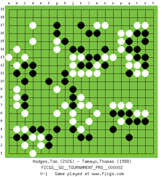 Last move : 0-1 2007 August 9 15:33:47 [Event "FICGS__GO__TOURNAMENT_PRO__000002"] [Site "FICGS"] [Date "2007.05.16"] [Round "1"] [Black "Hodges,Tom"] [White "Tamayo,Thomas"] [Result "0-1"] [Rating 1 "2026"] [Rating 2 "1988"] 1.r5 c4 2.q3 d17 3.e4 c6 4.c3 d3 5.d4 c2 6.b3 b4 7.d2 e3 8.f3 e2 9.f2 d1 10.g4 r17 11.q15 p16 12.q11 p5 13.o4 r6 14.q5 p7 15.q6 q7 16.p6 o7 17.o6 q13 18.r13 r12 19.r14 q12 20.s12 s11 21.s13 r11 22.s16 s17 23.r16 p15 24.s15 d15 25.k17 m17 26.g17 c11 27.c12 c13 28.d12 b12 29.b13 b14 30.b11 a13 31.c10 l5 32.k6 j5 33.k5 j6 34.j4 k7 35.j7 h7 36.j8 g6 37.d11 k8 38.j9 k4 39.l6 m6 40.k3 l7 41.l3 q16 42.q14 p14 43.l16 k11 44.m16 n17 45.h11 k13 46.m13 m12 47.n12 n13 48.n14 o13 49.l12 m11 50.l13 l11 51.k12 g15 52.h15 j11 53.h10 j12 54.k14 j13 55.j14 g14 56.g16 s6 57.s5 g9 58.f10 b9 59.c8 b8 60.c7 b7 0-1 Here are the names of the openings (joseki) played in the four corners : Corner d4 : c4 e4 Komoku (Somok, Xiao~mu`) 3-4 Point. The komoku (3-4) point is the traditional corner enclosure move.. Ikken Takagakari (Hankan Nop'dakeolch'im, Yi Gaogua`jiao~, 1-Space High Approach). The 5-4 approach move has become more popular in modern times, as modern Go emphasizes speed and influence. Corner q16 : r17 q15 San-San (Sam-Sam, San-San) 3-3 Point. The San-San (3-3) point, emphasizing territory at the expense of influence. Ikken Takagakari (Hankan Nop'dakeolch'im, Yi Gaokeolch'im, 1-Space High Approach). Black 2 is a high tight attack with a direction bias. Black continues with 4-5. Tactically, any other response is less advantageous. Player White won this Go (weiqi, baduk) game. Follow this game move after move (download)The possibility or impossibility of an event results logically from the rules. (Pierre Audouard) Opportunities multiply as they are seized. (Sun Tzu)