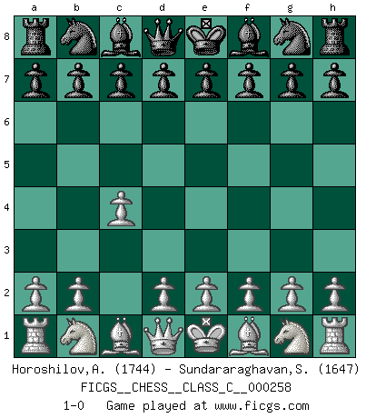 Last move : 1-0 2018 September 14 13:6:53 [Event "FICGS__CHESS__CLASS_C__000258"] [Site "FICGS"] [Date "2018.08.05"] [Round "1"] [White "Horoshilov,Andrey"] [Black "Sundararaghavan,Shailesh"] [Result "1-0"] [WhiteElo "1744"] [BlackElo "1647"] 1.c4 1-0 This chess game has been lost on time (started : 2018.08.05 6:36:4) English Opening Player White won this chess game. Follow this game move after move (download)Fischer wanted to give the Russians a taste of their own medicine. (Larry Evans) Ich kenne Menschen, die allen Willen der Welt besitzen und doch nicht Schach spielen können. (Robert James Fischer) El jugador de combinación piensa hacia adelante; comienza de la posición dada y trabaja las movidas contundentes en su mente. (Emanuel Lasker) Pour se monter efficace, un Cavalier a besoin d'avant-postes ! Les Cavaliers font les meilleurs bloqueurs de pions passés. Perception is reality. (Immanuel Kant)