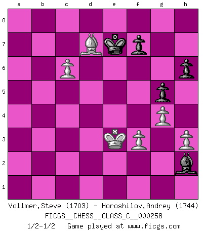 Last move : 1/2-1/2 2018 September 25 13:21:46 [Event "FICGS__CHESS__CLASS_C__000258"] [Site "FICGS"] [Date "2018.08.05"] [Round "1"] [White "Vollmer,Steve"] [Black "Horoshilov,Andrey"] [Result "1/2-1/2"] [WhiteElo "1703"] [BlackElo "1744"] 1.e4 c5 2.Nf3 d6 3.d4 cxd4 4.Nxd4 Nf6 5.Nc3 Nc6 6.Be2 e5 7.Nf3 h6 8.a4 Be7 9.O-O O-O 10.h3 Be6 11.Be3 d5 12.exd5 Nxd5 13.Nxd5 Bxd5 14.c4 Be4 15.Qxd8 Raxd8 16.Rfd1 b6 17.Ne1 Nd4 18.Bxd4 exd4 19.Nd3 Bf6 20.a5 Rc8 21.axb6 axb6 22.b3 g5 23.Ra6 Rb8 24.Rda1 Kg7 25.R1a4 b5 26.Ra1 bxc4 27.bxc4 Bxd3 28.Bxd3 Rfe8 29.g4 Rb3 30.Rd1 Rc3 31.Ra4 Rb8 32.Bf1 Rb2 33.Bd3 R2b3 34.Bf1 Be5 35.Ra5 Bf4 36.Rb5 Ra3 37.Rd5 d3 38.R5xd3 Rxd3 39.Rxd3 Rxd3 40.Bxd3 Kf6 41.Kg2 Ke6 42.Kf3 Kd6 43.Ke4 Ke6 44.Kd4 Bd6 45.c5 Bh2 46.f3 Ke7 47.Bf5 Bc7 48.Kd5 Bf4 49.c6 Bc7 50.Bd7 Bd6 51.Ke4 Bg3 52.Kf5 Bc7 53.Ke4 Bg3 54.Ke3 Bc7 55.Kf2 Bh2 56.Ke3 1/2-1/2 Sicilian Kingside Castling by player White (move 9) Kingside Castling by player Black (move 9) This chess game ended in a draw. Follow this game move after move (download)Bobby Fischer is the greatest Chess player who has ever lived. (Ken Smith) Unter Putin wird alles Geld aus Russland wie von einem Staubsauger nach Moskau umgeleitet, das ist wie ein schwarzes Loch. (Garry Kasparov) Alguna parte de un error es siempre correcto. (Savielly Tartakover) Lorsque vous vous retrouvez devant une position atroce, ne tendez pas un ultime piège dérisoire avec l'intention d'abandonner si l'adversaire le déjoue ! Faites-vous plutôt un devoir de résister comme si votre vie en dépendait. Jouez le coup qui vous déplairait au centuple si vous étiez dans la peau de votre tortionnaire ! Convictions are more dangerous enemies of truth than lies. (Friedrich Nietzsche)