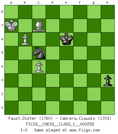 Last move : 1-0 2018 October 6 17:11:1 [Event "FICGS__CHESS__CLASS_C__000258"] [Site "FICGS"] [Date "2018.08.05"] [Round "1"] [White "Faust,Dieter"] [Black "Cabrera,Claudio"] [Result "1-0"] [WhiteElo "1760"] [BlackElo "1703"] 1.f4 d5 2.Nf3 c5 3.e3 Nc6 4.b3 Nf6 5.Bb2 e6 6.Ne5 Qc7 7.Nxc6 Qxc6 8.a4 Bd7 9.Be2 Be7 10.O-O O-O 11.Qe1 Ne4 12.Bb5 Qc7 13.Bxd7 Qxd7 14.d3 Nd6 15.Nd2 Nf5 16.g4 Nd6 17.e4 d4 18.e5 Ne8 19.f5 f6 20.Nc4 fxe5 21.Nxe5 Qd5 22.Nc4 Nc7 23.Bc1 Bd8 24.Qe4 exf5 25.gxf5 Bf6 26.Bd2 Rae8 27.Qg4 Qd7 28.Rae1 Rxe1 29.Rxe1 b6 30.Re4 Kh8 31.h4 Nd5 32.h5 a6 33.Qf3 b5 34.axb5 axb5 35.Ne5 Bxe5 36.Rxe5 Ne7 37.Rxc5 Rxf5 38.Rxf5 Qxf5 39.Qxf5 Nxf5 40.Kf2 g6 41.hxg6 h5 42.c4 bxc4 43.dxc4 Kg7 44.Ke2 Kxg6 45.b4 h4 46.Bf4 Ng3+ 47.Kf3 d3 48.b5 Ne2 49.Bc7 Nd4+ 50.Ke3 Nb3 51.Kxd3 Kf5 52.b6 Ke6 53.Kc3 Na5 54.Kb4 Nb7 55.Kb5 h3 56.Ka6 Nc5+ 57.Ka7 1-0 Bird's Opening Kingside Castling by player White (move 10) Kingside Castling by player Black (move 10) 10 pieces endgame at move 42 : White KBPPP , Black KNPPP WHITE : King + 1 Bishop 3 Pawns BLACK : King + 1 Knight 3 Pawns 9 pieces endgame at move 43 : White KBPPP , Black KNPP WHITE : King + 1 Bishop 3 Pawns BLACK : King + 1 Knight 2 Pawns 8 pieces endgame at move 44 : White KBPP , Black KNPP WHITE : King + 1 Bishop 2 Pawns BLACK : King + 1 Knight 2 Pawns 7 pieces endgame at move 51 : White KBPP , Black KNP WHITE : King + 1 Bishop 2 Pawns BLACK : King + 1 Knight 1 Pawn Player White won this chess game. Follow this game move after move (download)You know, comrade Pachman, I don't enjoy being a Minister, I would rather play Chess like you. (Che Guevara) Ein typischer, sehr verbreiteter Gedankenschädling ist der, daß der betreffende Amateur von der Annanhme ausgeht, daß jeder einzelne Zug etwas zu leisten habe. (Aaron Nimzowitsch) ¿Cual es el objetivo de jugar una apertura de gambito?... Para adquirir una reputación de ser un jugador apuesto a costo de perder el juego. (Siegbert Tarrasch) Un footballeur joue avec ses pieds, parfois avec sa tête. Un joueur d'échecs ne joue qu'avec sa tête. Et quand il ne joue plus, il meurt. (Jacob Murray) Life is the sum of all your choices. (Albert Camus)