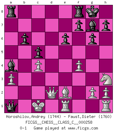Last move : 0-1 2018 August 28 18:9:3 [Event "FICGS__CHESS__CLASS_C__000258"] [Site "FICGS"] [Date "2018.08.05"] [Round "1"] [White "Horoshilov,Andrey"] [Black "Faust,Dieter"] [Result "0-1"] [WhiteElo "1744"] [BlackElo "1760"] 1.c4 c5 2.Nc3 Nf6 3.b3 g6 4.Bb2 Bg7 5.e3 O-O 6.f3 b6 7.Be2 e6 8.Qc2 Nc6 9.a3 d5 10.O-O-O d4 11.Ne4 Nxe4 12.Qxe4 Bd7 13.Nh3 a5 14.f4 a4 15.Qc2 axb3 16.Qxb3 Na5 17.Qa2 Ba4 18.Rde1 Nb3+ 19.Kd1 dxe3 20.Bc3 exd2 21.Bxd2 Nxd2 22.Kc1 Qd4 23.Qxd2 Qa1+ 0-1 English : Symmetrical variation Kingside Castling by player Black (move 5) Queenside Castling by player White (move 10) Player Black won this chess game. Follow this game move after move (download)Chess is a cold bath for the mind. (Sir John Simon) Rubinstein ist ein Turmendspiel, welches die Götter vor tausenden von Jahren begannen. (Savielly Grigorievitsch Tartakower) No hay un Gran Maestro de Ajedrez que sea normal; solo se diferencían ellos por la magnitud de su locura. (Viktor Korchnoi) Dans le domaine de la peinture, de la gravure et de la sculpture, dès la première décennie de notre siècle, les artistes abandonnent la représentation de la partie d'échecs pour se concentrer sur les pièces, sur les échiquiers et sur toutes les variations auxquelles les unes et les autres peuvent donner lieu. On passe en quelque sorte d'un thème social à un thème musical (au sens de la musica médiévale, c'est-à-dire d'une notion qui inclue le rythme, l'harmonie, la construction et la déconstruction, etc.). Graphiquement et picturalement, l'échiquier apparaît comme une structure ouverte, dynamique, d'une richesse infinie, autorisant toutes les combinatoires et débouchant sur des mouvements et des rythmes de nature exponentielle. (Michel Pastoureau) Creativity is inventing, experimenting, growing, taking risks, breaking rules, making mistakes, and having fun. (Mary Lou Cook)