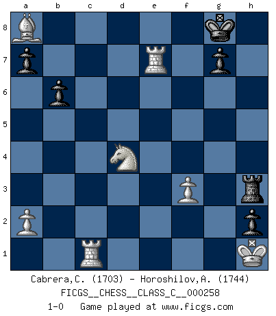 Last move : 1-0 2018 August 16 3:59:30 [Event "FICGS__CHESS__CLASS_C__000258"] [Site "FICGS"] [Date "2018.08.05"] [Round "1"] [White "Cabrera,Claudio"] [Black "Horoshilov,Andrey"] [Result "1-0"] [WhiteElo "1703"] [BlackElo "1744"] 1.c4 e5 2.Nc3 Nf6 3.Nf3 d5 4.cxd5 Nxd5 5.Nxe5 Nxc3 6.bxc3 Bd6 7.Nf3 O-O 8.g3 Bg4 9.Bg2 Nd7 10.O-O h6 11.d4 c6 12.Qb3 b6 13.e4 Be6 14.Qc2 f5 15.e5 Bc7 16.Nh4 f4 17.Qg6 fxg3 18.Qxe6+ Kh7 19.Qg6+ Kg8 20.Bxh6 Rf7 21.e6 gxh2+ 22.Kh1 Re7 23.exd7 Qxd7 24.Bxc6 Qe6 25.Qxe6+ Rxe6 26.Bxa8 Rxh6 27.Nf5 Rh3 28.f3 Bf4 29.Rae1 Bd2 30.Re7 Bxc3 31.Rc1 Bxd4 32.Nxd4 1-0 English Opening Kingside Castling by player Black (move 7) Kingside Castling by player White (move 10) Player White won this chess game. Follow this game move after move (download)If one piece is badly posted, the whole game is bad. (Tarrasch) Vielleicht wirkt die Aura früherer Spieler glanzvoller als die der heutigen Spieler, aber das liegt daran, dass man kein Programm wie Fritz hatte, das einem all die Löcher in ihren Partien zeigt. (Vladimir Kramnik) Debió haber existido una vez en que los hombres eran semidióses, de otra manera no hubiesen podido inventar el Ajedrez. (Gustav Schenk) Vouloir jouer aux échecs contre soi-même est aussi paradoxal que vouloir marcher sur son ombre. (Stefan Zweig) Be who you are, and say what you feel because those who mind don't matter, and those who matter don't mind. (Dr Seuss)