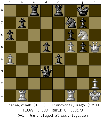 Last move : 0-1 2018 November 15 22:38:38 [Event "FICGS__CHESS__RAPID_C__000178"] [Site "FICGS"] [Date "2018.08.05"] [Round "1"] [White "Sharma,Vivek"] [Black "Fioravanti,Diego"] [Result "0-1"] [WhiteElo "1609"] [BlackElo "1751"] 1.e4 e6 2.d4 d5 3.e5 c5 4.Nf3 Nc6 5.Nc3 cxd4 6.Nxd4 Nxe5 7.Bb5+ Bd7 8.O-O Nf6 9.Bf4 Ng6 10.Bg5 Be7 11.Qf3 O-O 12.a4 a6 13.Bxd7 Nxd7 14.Bxe7 Qxe7 15.Rae1 Qb4 16.Nce2 Nge5 17.Qh3 Rfe8 18.b3 Rac8 19.f4 Nc6 20.Nf3 Qc5+ 21.Kh1 Qxc2 22.Ng5 h6 23.Nf3 Qxb3 24.Ng3 Nf6 25.f5 e5 26.Nh5 Nxh5 27.Qxh5 e4 28.Nh4 f6 29.g4 Ne5 30.g5 hxg5 31.Ng6 Nf7 32.Rb1 Qd3 0-1 This chess game has been lost on time (started : 2018.08.05 6:37:5) French : Advance, Nimzovich system Kingside Castling by player White (move 8) Kingside Castling by player Black (move 11) Player Black won this chess game. Follow this game move after move (download)Fischer is completely natural. He plays no roles. He's like a child. Very, very simple. (Zita Rajcsanyi) Die Leute spielen gegen mich seit 15 Jahren unter Ihren Möglichkeiten. (Robert James Fischer) Si no le temes a Spassky, entonces elimino el elemento del dinero. (Jim Slater) J'ai toujours senti une vague pitié pour l'homme qui ne connaît rien aux échecs, tout comme j'en aurais pour un homme ignorant de l'amour. Les Echecs, comme la musique ou comme l'amour, ont le pouvoir de rendre heureux. (Siegbert Tarrasch) If we knew what we were doing, we would not call it research. (Albert Einstein)