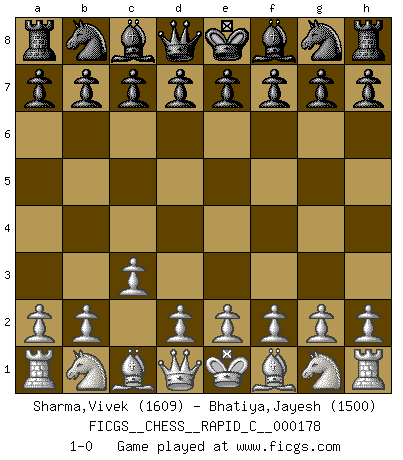 Last move : 1-0 2018 September 4 11:45:12 [Event "FICGS__CHESS__RAPID_C__000178"] [Site "FICGS"] [Date "2018.08.05"] [Round "1"] [White "Sharma,Vivek"] [Black "Bhatiya,Jayesh"] [Result "1-0"] [WhiteElo "1609"] [BlackElo "1500"] 1.c3 1-0 This chess game has been lost on time (started : 2018.08.05 6:37:5) Saragossa Opening Player White won this chess game. Follow this game move after move (download)Life is a kind of Chess, with struggle, competition, good and ill events. (Benjamin Franklin) Im Hotelzimmer gab es nur zwei Schaben. (Über die Turnierbedingungen) (Peter Swidler) Una buena memoria, concentración, imaginación y una fuerte voluntad, se requiere para llegar a ser un buen jugador. (Bobby Fischer) Les Echecs, c'est l'art de la guerre sans les charniers, c'est la résurrection des morts tombés au champ d'honneur, l'espoir perpétuel, la suprématie de l'intelligence sur la force, la culture de l'esprit. (F. Szpiner) At work, the authority of a person is inversely proportional to the number of pens that person is carrying. (Dan Rotaru)