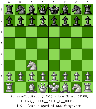 Last move : 1-0 2018 September 4 11:45:12 [Event "FICGS__CHESS__RAPID_C__000178"] [Site "FICGS"] [Date "2018.08.05"] [Round "1"] [White "Fioravanti,Diego"] [Black "Uye,Sinay"] [Result "1-0"] [WhiteElo "1751"] [BlackElo "1500"] 1.Nc3 1-0 This chess game has been lost on time (started : 2018.08.05 6:37:5) Dunst (Sleipner, Heinrichsen) Opening Player White won this chess game. Follow this game move after move (download)The hallmark of the artist is simplicity. (Larry Evans) Nie in meinem Leben habe ich die französische Verteidigung gespielt, welche die Stumpfsinnigste von allen ist. (Wilhelm Steinitz) Me gusta decir que Bobby Fischer fue el mejor jugador que jamás haya existido. Pero lo que hizo de Fischer un genio, fue su habilidad de mezclar una frescura y pragmatismo Americano con ideas Rusas acerca de la estrategia. (Bruce Pandolfini) La vie est comme un jeu d'échecs : nous esquissons un plan, mais celui-ci est tributaire de ce que daignent faire l'adversaire aux échecs et le destin dans la vie. (Arthur Schopenhauer) Locking firmely the window serves nothing, only small thiefs pass through there, the big thiefs enter through the front door. (Luc-Olivier Leclerc)