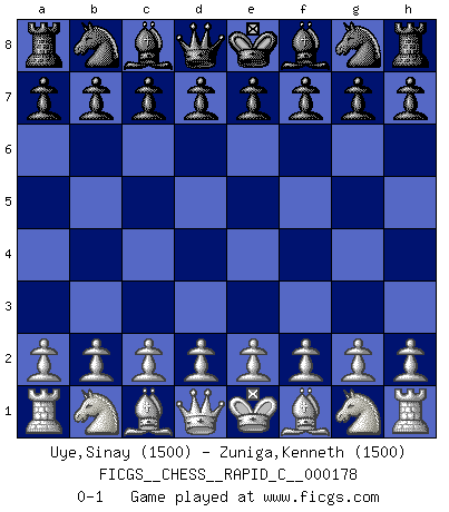 Last move : 0-1 2018 September 4 11:45:12 [Event "FICGS__CHESS__RAPID_C__000178"] [Site "FICGS"] [Date "2018.08.05"] [Round "1"] [White "Uye,Sinay"] [Black "Zuniga,Kenneth"] [Result "0-1"] [WhiteElo "1500"] [BlackElo "1500"] 0-1 This chess game has been lost on time (started : 2018.08.05 6:37:5) Player Black won this chess game. Follow this game move after move (download)I'd rather have a Pawn than a finger. (Reuben Fine) Ich bin der einzige Schachspieler, der sich während der Vorbereitungen zum Turnier verletzt hat. (Woody Allen) Nada excita más a Grandes Maestros aburridos que una novedad teórica. (Dominic Lawson) Pour se monter efficace, un Cavalier a besoin d'avant-postes ! Les Cavaliers font les meilleurs bloqueurs de pions passés. War is the child of passion, passion is the child of narcissism and narcissism is the child. (...) Another game ? (Thibault de Vassal)