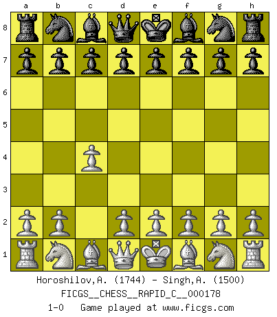 Last move : 1-0 2018 September 4 11:45:12 [Event "FICGS__CHESS__RAPID_C__000178"] [Site "FICGS"] [Date "2018.08.05"] [Round "1"] [White "Horoshilov,Andrey"] [Black "Singh,Arshvinder"] [Result "1-0"] [WhiteElo "1744"] [BlackElo "1500"] 1.c4 1-0 This chess game has been lost on time (started : 2018.08.05 6:37:5) English Opening Player White won this chess game. Follow this game move after move (download)Methodical thinking is of more use in Chess than inspiration. (C. J. S. Purdy) Schach wird sich dank seiner hohen kulturellen Tradition immer durchsetzen. In näherer Zukunft womöglich sogar als Gegenreaktion auf die maßlose Reizüberflutung im Freizeit- und Spielbereich. (Garry Kasparov) Muchos se han convertido en Maestros de Ajedrez, nadie se ha convertido en el Maestro del Ajedrez. (Siegbert Tarrasch) Les échecs sont plus proches de l'art de l'assassinat que de l'art de la guerre. (Arturo Perez-Reverte) I live to kill Traxler counterattack. (Ilmars Cirulis)