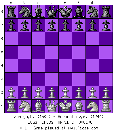 Last move : 0-1 2018 September 4 11:45:12 [Event "FICGS__CHESS__RAPID_C__000178"] [Site "FICGS"] [Date "2018.08.05"] [Round "1"] [White "Zuniga,Kenneth"] [Black "Horoshilov,Andrey"] [Result "0-1"] [WhiteElo "1500"] [BlackElo "1744"] 0-1 This chess game has been lost on time (started : 2018.08.05 6:37:5) Player Black won this chess game. Follow this game move after move (download)A great player and a great example for many. His book My 60 Memorable Games had a big impact on me. It is a shame he didn't continue to enrich the world of chess with his unparalleled understanding after 1972. (Jan Timman, about Bobby Fischer's death) Warum muß ich gegen diesen IDIOTEN verlieren? (Aaron Nimzowitsch) Aún el Rey más flojo huye despavorido ante la amenaza de un Jaque doble. (Aaron Nimzowitsch) On entre au jeu d'Echecs comme on entre en Religion. Pour le joueur d'Echecs, la partie d'Echecs c'est l'office, la messe, le défilé du 1er Mai, le dépôt de gerbe au Monument aux Morts. C'est un drame sacré. (Michel Roos) Don't be irreplaceable, if you can't be replaced, you can't be promoted. (Dan Rotaru)