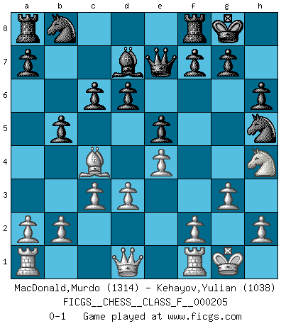 Last move : 0-1 2018 November 1 21:32:40 [Event "FICGS__CHESS__CLASS_F__000205"] [Site "FICGS"] [Date "2018.08.05"] [Round "1"] [White "MacDonald,Murdo"] [Black "Kehayov,Yulian"] [Result "0-1"] [WhiteElo "1314"] [BlackElo "1038"] 1.e4 e5 2.Nf3 d6 3.Bc4 Nf6 4.Nc3 Be7 5.O-O O-O 6.d3 Bd7 7.Bg5 h6 8.Bh4 Nh5 9.Nd5 Bxh4 10.g3 Be7 11.c3 c6 12.Nxe7+ Qxe7 13.Nh4 b5 0-1 Philidor's defense Kingside Castling by player White (move 5) Kingside Castling by player Black (move 5) Player Black won this chess game. Follow this game move after move (download)You need not play well - just help your opponent to play badly. (Genrikh Chepukaitis) Der Schachmeister von Heute braucht Courage, einen Killerinstinkt, Ausdauer und Arroganz. (Larry Evans) Repentinamente, me resultaba obvio en mi analisis que yo había pasado por alto lo que Fischer había visto en el tablero con la mas grande facilidad. (Mikhail Botvinnik) Soyez une menace à chaque fois que vous vous asseyez pour jouer. (Ken Smith) I believe in luck. How else can you explain the success of those you dislike ? (Jean Cocteau)
