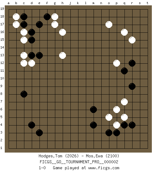 Last move : 1-0 2007 July 21 6:9:23 [Event "FICGS__GO__TOURNAMENT_PRO__000002 "] [Site "FICGS"] [Date "2007.05.16"] [Round "1"] [Black "Hodges,Tom "] [White "Mos,Ewa "] [Result "1-0"] [Rating 1 "2026"] [Rating 2 "2100"] 1.d4 q16 2.r4 c16 3.e17 h16 4.d16 c15 5.c17 b17 6.c18 c12 7.c8 p4 8.m4 q7 9.p5 o5 10.q4 p6 11.p3 q5 12.o3 o17 13.r12 r15 14.r9 p12 15.q11 g18 16.d13 c13 17.d15 d12 18.e13 h13 19.e3 b18 20.f18 g17 21.m6 1-0 This go game has been lost on time (started : 2007.05.16 16:49:44) Here are the names of the openings (joseki) played in the four corners : Corner d16 : c16 e17Komoku (Somok, Xiao~mu`) 3-4 Point. The komoku (3-4) point is the traditional corner enclosure move..Ikken Kakari (Hankan Keolch'im, Yi Gua`jiao~, 1-Space Low Pincer). The small knight move is the basic approach move to the 3-4 point stone. It has been continually used for over four centuries. There are limitless variations, with new moves constantly being discovered. Black 2 opens the door to a treaure store of joseki. Corner q4 : r4 p4Komoku (Somok, Xiao~mu`) 3-4 Point. The komoku (3-4) point is the traditional corner enclosure move..Ikken Takagakari (Hankan Nop'dakeolch'im, Yi Gaogua`jiao~, 1-Space High Approach). The 5-4 approach move has become more popular in modern times, as modern Go emphasizes speed and influence. Player Black won this Go (weiqi, baduk) game.Follow this game move after move (download ) Don't make empty triangles. (Anonymous) Without enthusiasm, virtue functions not at all, and vice only poorly. (Mignon McLaughlin, The Neurotic's Notebook, 1960)