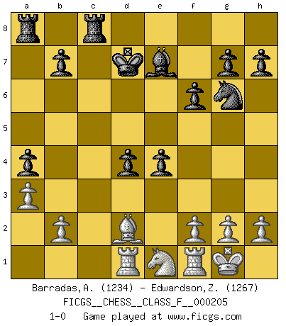 Last move : 1-0 2019 January 1 15:50:54 [Event "FICGS__CHESS__CLASS_F__000205"] [Site "FICGS"] [Date "2018.08.05"] [Round "1"] [White "Barradas,Anderson"] [Black "Edwardson,Zachariah"] [Result "1-0"] [WhiteElo "1234"] [BlackElo "1267"] 1.e4 e6 2.d4 d5 3.e5 c5 4.c3 Nc6 5.Nf3 Bd7 6.Be2 Nge7 7.Nbd2 cxd4 8.cxd4 a5 9.O-O Nf5 10.Nb3 a4 11.Nc5 Nfxd4 12.Nxd7 Nxe2+ 13.Qxe2 Qxd7 14.Be3 Be7 15.Ng5 Nxe5 16.Bf4 Ng6 17.Qg4 e5 18.Qxd7+ Kxd7 19.Bd2 f6 20.Nf3 d4 21.a3 Rhc8 22.Ne1 e4 23.Rd1 1-0 French : Advance, Euwe variation Kingside Castling by player White (move 9) Player White won this chess game. Follow this game move after move (download)Every Chess master was once a beginner. (Chernev) Vielleicht wirkt die Aura früherer Spieler glanzvoller als die der heutigen Spieler, aber das liegt daran, dass man kein Programm wie Fritz hatte, das einem all die Löcher in ihren Partien zeigt. (Vladimir Kramnik) El Ajedrez es realmente noventa y nueve por ciento calculación. (Soltis) La conception d'un plan est le processus par lequel un joueur exploite les avantages de sa position tout en s'efforçant d'en réduire au minimum les inconvénients. Afin de garantir le succès, un plan doit toujours se fonder sur un diagnostic objectif des particularités d'une position. La conception d'un plan est d'autant plus difficile que la position est équilibrée, et grandement facilitée lorsqu'il n'existe qu'un seul plan susceptible de répondre aux exigences de la position. (Harry Golombek) Establishing goals is all right if you don't let them deprive you of interesting detours. (Doug Larson)