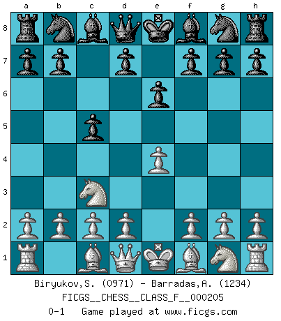 Last move : 0-1 2018 September 17 1:14:39 [Event "FICGS__CHESS__CLASS_F__000205"] [Site "FICGS"] [Date "2018.08.05"] [Round "1"] [White "Biryukov,Sergey"] [Black "Barradas,Anderson"] [Result "0-1"] [WhiteElo "0971"] [BlackElo "1234"] 1.e4 c5 2.Nc3 e6 0-1 This chess game has been lost on time (started : 2018.08.05 10:40:23) Sicilian : Closed Player Black won this chess game. Follow this game move after move (download)In blitz, the Knight is stronger than the Bishop. (Vlastimil Hort) Darum geht es im Schach. Einen Tag gibst du deinem Gegner eine Lektion, am nächsten Tag gibt er dir eine. (Robert James Fischer) El juego de Fischer siempre fue nítido, racional y brillante. Uno de los mejores por siempre. (Dave Regis) Le moment que je préfère le plus dans une rencontre, c'est celui où je sens que la personnalité de l'adversaire se brise. (Robert Fischer) May I never be complete. May I never be content. May I never be perfect. Deliver me, Tyler, from being perfect and complete. (Chuck Palahniuk, Fight Club)