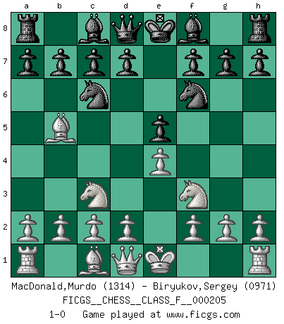 Last move : 1-0 2018 September 15 1:6:4 [Event "FICGS__CHESS__CLASS_F__000205"] [Site "FICGS"] [Date "2018.08.05"] [Round "1"] [White "MacDonald,Murdo"] [Black "Biryukov,Sergey"] [Result "1-0"] [WhiteElo "1314"] [BlackElo "0971"] 1.e4 e5 2.Nf3 Nf6 3.Nc3 Nc6 4.Bb5 1-0 This chess game has been lost on time (started : 2018.08.05 10:40:23) Petrov Three knights game Player White won this chess game. Follow this game move after move (download)When you see a good move, look for a better one. (Emanuel Lasker) Auf Remis zu spielen ist gewissermaßen ein Verbrechen gegen das Schachspiel. (Mikhail Nekhemyevich Tal) Solo puedes ser bueno en el Ajedrez si amas al juego. (Bobby Fischer) La vie et les Echecs sont tous les deux une lutte constante. (Lasker) The message for business people contemplating their place in the cyberspace is simple and direct: get linked or get lost. (Vic Sussman and Kenan Pollack)