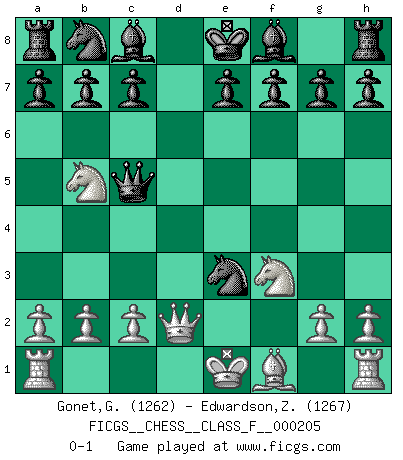 Last move : 0-1 2018 August 13 17:52:47 [Event "FICGS__CHESS__CLASS_F__000205"] [Site "FICGS"] [Date "2018.08.05"] [Round "1"] [White "Gonet,Gerard"] [Black "Edwardson,Zachariah"] [Result "0-1"] [WhiteElo "1262"] [BlackElo "1267"] 1.d4 d5 2.e4 dxe4 3.Nc3 Nf6 4.f3 exf3 5.Qxf3 Qxd4 6.Be3 Qg4 7.Qf2 Qf5 8.Nf3 Ng4 9.Qd2 Nxe3 10.Nb5 Qc5 0-1 Blackmar gambit Player Black won this chess game. Follow this game move after move (download)Discovered check is the dive bomber of the Chessboard. (Reuben Fine) Das Schach ist nichts für kleine Geister, es beansprucht einen vollen Mann, der sich nicht sklavisch an das Überlieferte hält, sondern selbständig die Tiefen des Spiels zu ergründen sucht. (Wilhelm Steinitz) A la fecha, Fischer esta simplemente un nivel arriba de todos los mejores jugadores de Ajedrez del mundo. (John Jacobs) Les Echecs ont trois composantes : le temps, l'espace et le matériel en dernier. (Mikhail Tal) Luck is when opportunity knocks and you answer. (Anonymous)