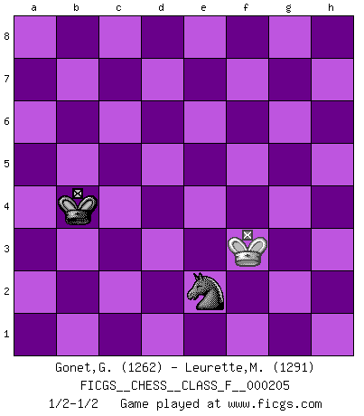 Last move : 1/2-1/2 2018 August 27 13:38:7 [Event "FICGS__CHESS__CLASS_F__000205"] [Site "FICGS"] [Date "2018.08.05"] [Round "1"] [White "Gonet,Gerard"] [Black "Leurette,Marc-Antoine"] [Result "1/2-1/2"] [WhiteElo "1262"] [BlackElo "1291"] 1.d4 d5 2.e4 dxe4 3.Nc3 Nf6 4.f3 exf3 5.Qxf3 Qxd4 6.Be3 Qb4 7.O-O-O c6 8.Rd4 Qa5 9.h3 e5 10.Ra4 Qc7 11.Qf2 a6 12.Nf3 Be7 13.Bb6 Qd6 14.Be2 O-O 15.Rd1 Qe6 16.g4 e4 17.Ng5 Qe5 18.Bd4 Qxg5+ 19.Kb1 b5 20.Be3 Qe5 21.Rad4 Bc5 22.Rd8 Be6 23.Bxc5 Re8 24.Rxe8+ Nxe8 25.Rd8 Bd7 26.Qe3 Qf6 27.Bb6 h6 28.Nxe4 Qe5 29.Bd4 Qe7 30.Bb6 f6 31.Bf3 Kf7 32.Qd3 Be6 33.Nc5 Nd7 34.Nxe6 Kxe6 35.Rxa8 Nxb6 36.Rb8 Nd7 37.Rb6 Nxb6 38.Bxc6 Nd6 39.Qe3+ Kf7 40.Qxe7+ Kxe7 41.c3 a5 42.Kc2 b4 43.cxb4 axb4 44.Kb3 Ndc4 45.Bb5 Nd6 46.Bc6 Ke6 47.Kxb4 Nd5+ 48.Ka5 g5 49.b4 Nc4+ 50.Ka6 Kd6 51.b5 Ne5 52.Ba8 Nf4 53.b6 Nd7 54.Ka7 Nxh3 55.b7 Nf4 56.b8Q+ Nxb8 57.Kxb8 h5 58.gxh5 Nxh5 59.Bf3 Ng3 60.a4 Kc5 61.Kb7 Kb4 62.Kc6 Kxa4 63.Kd5 f5 64.Ke5 g4 65.Bxg4 fxg4 66.Kf4 Ne2+ 67.Kxg4 Kb4 68.Kf3 1/2-1/2 Blackmar gambit Queenside Castling by player White (move 7) Kingside Castling by player Black (move 14) Promotion Queen by player White (move 56) 10 pieces endgame at move 56 : White KBPP , Black KNNPPP WHITE : King + 1 Bishop 2 Pawns BLACK : King + 2 Knights 3 Pawns 9 pieces endgame at move 57 : White KBPP , Black KNPPP WHITE : King + 1 Bishop 2 Pawns BLACK : King + 1 Knight 3 Pawns 8 pieces endgame at move 58 : White KBPP , Black KNPP WHITE : King + 1 Bishop 2 Pawns BLACK : King + 1 Knight 2 Pawns 7 pieces endgame at move 58 : White KBP , Black KNPP WHITE : King + 1 Bishop 1 Pawn BLACK : King + 1 Knight 2 Pawns 6 pieces endgame at move 62 : White KB , Black KNPP WHITE : King + 1 Bishop BLACK : King + 1 Knight 2 Pawns 5 pieces endgame at move 65 : White KB , Black KNP WHITE : King + 1 Bishop BLACK : King + 1 Knight 1 Pawn 4 pieces endgame at move 65 : White K , Black KNP WHITE : King + BLACK : King + 1 Knight 1 Pawn 3 pieces endgame at move 67 : White K , Black KN WHITE : King + BLACK : King + 1 Knight This chess game ended in a draw. Follow this game move after move (download)The older I grow, the more I value pawns. (Paul Keres) Ich verstehe mehr vom Schach als irgendein anderer lebender Meister. (José Raúl Capablanca) ¿Esta Bobby Fischer algo cuerdo?. (Salo Flohr) Botvinnik disait en comparant les échecs à la musique: Il existe une science dont le but est l'étude de l'acoustique et des sons. Mais il y a aussi un art qui se sert de l'océan des sons : c'est la musique. De toute évidence, il en est de même pour la pensée. La logique est l'étude des lois de la réflexion et les échecs reflètent, en tant qu'art, le côté logique de la réflexion, sous la forme d'images artistiques... Extrait de Fischer - Spassky, Reykjavik 1972 par Alexander & F. Wyndham (Ed. Solar), p 37. All maxims have their antagonist maxims; proverbs should be sold in pairs, a single one being but a half truth. (William Mathews)