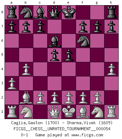 Last move : 0-1 2018 September 16 1:10:48 [Event "FICGS__CHESS__UNRATED_TOURNAMENT__000054"] [Site "FICGS"] [Date "2018.08.06"] [Round "1"] [White "Caglia,Gaston"] [Black "Sharma,Vivek"] [Result "0-1"] [WhiteElo "1700"] [BlackElo "1609"] 1.a3 d5 2.b4 e5 3.h4 Nf6 4.Bb2 Bd6 0-1 This chess game has been lost on time (started : 2018.08.06 8:34:46) Anderssen's Opening Player Black won this chess game. Follow this game move after move (download)First-class players lose to second-class players because second-class players sometimes play a first-class game. (Siegbert Tarrasch) Schach ist Krieg, im Schach geht es um testosterongesteuerte Urschreie. (Garry Kasparov) La vida es como un juego de Ajedrez, cambiando con cada movimiento. (Proverbio Chino) Je ne suis pas le dernier à jouer lâchement des coups douteux pendant le zeïtnot de l'adversaire pour l'achever: en effet les coups qui font le plus peur sont ceux que l'on ne comprend pas. Je me fais souvent peur quand je joue. (Un professeur anonyme) Life is verb, not a noun. (Charlotte Perkins Gilman)