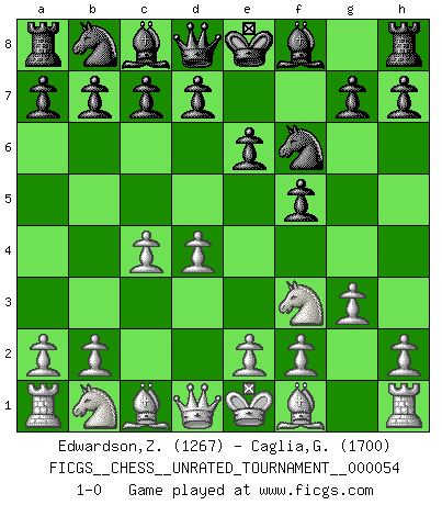 Last move : 1-0 2018 September 20 1:51:34 [Event "FICGS__CHESS__UNRATED_TOURNAMENT__000054"] [Site "FICGS"] [Date "2018.08.06"] [Round "1"] [White "Edwardson,Zachariah"] [Black "Caglia,Gaston"] [Result "1-0"] [WhiteElo "1267"] [BlackElo "1700"] 1.d4 f5 2.c4 Nf6 3.Nf3 e6 4.g3 1-0 This chess game has been lost on time (started : 2018.08.06 8:34:46) Dutch defense Player White won this chess game. Follow this game move after move (download)Chess makes man wiser and clear-sighted. (Vladimir Putin) Smyslow ist ein Beweis dafür, dass ich noch zehn Jahre spielen kann! [der 75 jährige über den 85 jährigen] (Viktor Kortschnoi) Un Peón pasado es un criminal, quién debe ser mantenido bajo candado y llave. Leves medidas, tales como vigilancia policiaca, no son suficientes. (Aaron Nimzovich) Fischer est le meilleur joueur du monde et Karpov n'est qu'un joueur de bistrot. (Garry Kasparov, agé de 16 ans) Nowadays, anyone who cannot speak English and is incapable of using the Internet is regarded as backward. (Al-Waleed bin Talal)