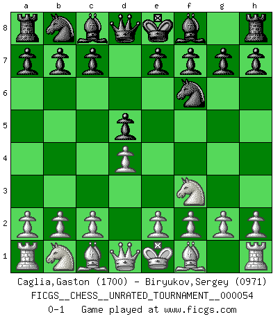 Last move : 0-1 2018 October 24 21:53:18 [Event "FICGS__CHESS__UNRATED_TOURNAMENT__000054"] [Site "FICGS"] [Date "2018.08.06"] [Round "1"] [White "Caglia,Gaston"] [Black "Biryukov,Sergey"] [Result "0-1"] [WhiteElo "1700"] [BlackElo "0971"] 1.Nf3 Nf6 2.d4 d5 0-1 This chess game has been lost on time (started : 2018.08.06 8:34:46) Reti Opening Player Black won this chess game. Follow this game move after move (download)Fischer Chess play was always razor-sharp, rational and brilliant. One of the best ever. (Dave Regis) Es gibt keine einzige Frau, der ich nicht einen Springer vorgeben könnte und trotzdem gewänne. (Robert James Fischer) El Ajedrez es una hermosa aventura. (Bent Larsen) J'apprécie les joueurs d'est-indienne, c'est grâce à eux que je nourris ma famille depuis tant d'années. (Petrosian) I'll be back. (Arnold Schwarzenegger)