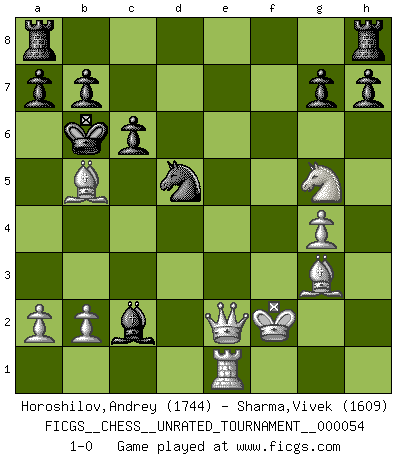 Last move : 1-0 2018 August 8 16:34:28 [Event "FICGS__CHESS__UNRATED_TOURNAMENT__000054"] [Site "FICGS"] [Date "2018.08.06"] [Round "1"] [White "Horoshilov,Andrey"] [Black "Sharma,Vivek"] [Result "1-0"] [WhiteElo "1744"] [BlackElo "1609"] 1.e4 e5 2.f4 exf4 3.Nf3 Be7 4.h4 d5 5.d4 Bg4 6.Qd2 Nc6 7.Qxf4 Bh5 8.g4 Bg6 9.Nc3 dxe4 10.Nxe4 Nxd4 11.Bd3 Nxf3+ 12.Qxf3 Bxh4+ 13.Ke2 Qe7 14.Rxh4 Qxh4 15.Bb5+ c6 16.Nd6+ Kd7 17.Bf4 Qe7+ 18.Kf2 Bxc2 19.Re1 Qh4+ 20.Bg3 Qg5 21.Qxf7+ Ne7 22.Qe6+ Kc7 23.Nf7 Kb6 24.Nxg5 Nd5 25.Qe2 1-0 KGA : Cunningham defense Player White won this chess game. Follow this game move after move (download)After a bad opening, there is hope for the middle game. After a bad middle game, there is hope for the endgame. But once you are in the endgame, the moment of truth has arrived. (Edmar Mednis) Schach wird sich dank seiner hohen kulturellen Tradition immer durchsetzen. In näherer Zukunft womöglich sogar als Gegenreaktion auf die maßlose Reizüberflutung im Freizeit- und Spielbereich. (Garry Kasparov) Muchos se han convertido en Maestros de Ajedrez, nadie se ha convertido en el Maestro del Ajedrez. (Siegbert Tarrasch) La conception d'un plan est le processus par lequel un joueur exploite les avantages de sa position tout en s'efforçant d'en réduire au minimum les inconvénients. Afin de garantir le succès, un plan doit toujours se fonder sur un diagnostic objectif des particularités d'une position. La conception d'un plan est d'autant plus difficile que la position est équilibrée, et grandement facilitée lorsqu'il n'existe qu'un seul plan susceptible de répondre aux exigences de la position. (Harry Golombek) Humor is by far the most significant activity of the human brain. (Edward De Bono)