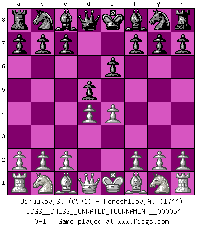 Last move : 0-1 2018 September 16 1:10:48 [Event "FICGS__CHESS__UNRATED_TOURNAMENT__000054"] [Site "FICGS"] [Date "2018.08.06"] [Round "1"] [White "Biryukov,Sergey"] [Black "Horoshilov,Andrey"] [Result "0-1"] [WhiteElo "0971"] [BlackElo "1744"] 1.e4 e6 2.d4 d5 0-1 This chess game has been lost on time (started : 2018.08.06 8:34:46) French defense Player Black won this chess game. Follow this game move after move (download)Chess is a cold bath for the mind. (Sir John Simon) Die größte Kunst beim Schach besteht darin dem Gegner nicht zu zeigen was er tun kann. (Garry Kasparov) No nos podemos resistir a la fascinación de un sacrificio ya que la pasión por los sacrificios es parte de la naturaleza de un jugador de Ajedrez. (Rudolf Spielman) Même si l'adversaire joue le coup analysé précédemment, recommencez l'analyse en voyant la nouvelle position. Première règle de Blumenfeld The beginning of wisdom is silence. The second step is listening. (Unknown)