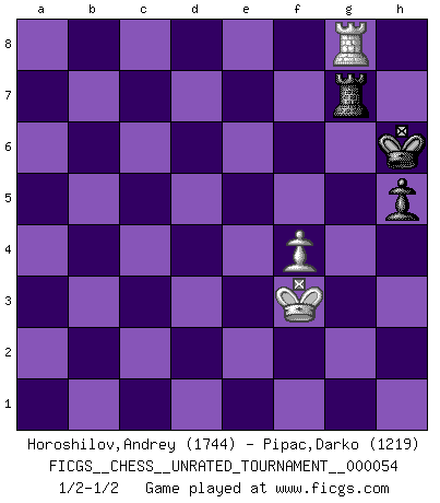 Last move : 1/2-1/2 2018 September 5 10:29:0 [Event "FICGS__CHESS__UNRATED_TOURNAMENT__000054"] [Site "FICGS"] [Date "2018.08.06"] [Round "1"] [White "Horoshilov,Andrey"] [Black "Pipac,Darko"] [Result "1/2-1/2"] [WhiteElo "1744"] [BlackElo "1219"] 1.e4 e5 2.Nf3 Nc6 3.d4 exd4 4.Nxd4 Nxd4 5.Qxd4 h6 6.Bc4 c6 7.O-O Qb6 8.Qxb6 axb6 9.Be3 b5 10.Bb3 Nf6 11.f3 c5 12.c4 bxc4 13.Bxc4 b6 14.Nc3 Ba6 15.Nb5 Bxb5 16.Bxb5 Bd6 17.a4 O-O 18.b3 Be5 19.Rab1 d5 20.exd5 Nxd5 21.Bd2 Rad8 22.g3 Bd4+ 23.Kh1 Rd6 24.Rbd1 Rfd8 25.Rfe1 Bc3 26.Bxc3 Nxc3 27.Rxd6 Rxd6 28.Re8+ Kh7 29.Bc4 f6 30.Bg8+ Kg6 31.h4 Rd3 32.Kg2 Nd5 33.Bxd5 Rxd5 34.Re6 c4 35.bxc4 Rc5 36.Rxb6 Rxc4 37.a5 Ra4 38.a6 h5 39.Kf2 Kf5 40.Ke3 g5 41.Rb5+ Kg6 42.hxg5 fxg5 43.f4 gxf4+ 44.gxf4 Rxa6 45.Rg5+ Kh6 46.Rg8 Ra7 47.Kf3 Rg7 1/2-1/2 Scotch game Kingside Castling by player White (move 7) Kingside Castling by player Black (move 17) 10 pieces endgame at move 42 : White KRPPPP , Black KRPP WHITE : King + 1 Rook 4 Pawns BLACK : King + 1 Rook 2 Pawns 9 pieces endgame at move 42 : White KRPPP , Black KRPP WHITE : King + 1 Rook 3 Pawns BLACK : King + 1 Rook 2 Pawns 8 pieces endgame at move 43 : White KRPP , Black KRPP WHITE : King + 1 Rook 2 Pawns BLACK : King + 1 Rook 2 Pawns 7 pieces endgame at move 44 : White KRPP , Black KRP WHITE : King + 1 Rook 2 Pawns BLACK : King + 1 Rook 1 Pawn 6 pieces endgame at move 44 : White KRP , Black KRP WHITE : King + 1 Rook 1 Pawn BLACK : King + 1 Rook 1 Pawn This chess game ended in a draw. Follow this game move after move (download)Chess, like love, is infectious at any age. (Flohr) Bis zum Jahr 1971 verlief in meiner Schachkariere alles glatt. Dieses dramatische Match [Fischer-Taimanov 6:0] machte mein Leben zur Hölle. (Mark Taimanov) El juego del Ajedrez no es solamente una diversión quieta; algunas cualidades muy valuables de la mente se pueden adquirir y cultivar con el, como convertirlos en habitos disponibles para toda ocasión; ya que la vida es algo así como el Ajedrez. (Benjamin Franklin) On croit qu'il y a plus de mauvais joueurs que de bons joueurs, c'est faux : Il y a autant de joueurs qui gagnent que de joueurs qui perdent. (Philippe Geluck) If you know the enemy and know yourself you need not fear the results of a hundred battles. (Sun Tzu)
