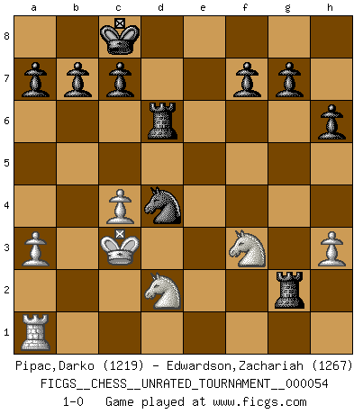 Last move : 1-0 2018 December 25 2:55:16 [Event "FICGS__CHESS__UNRATED_TOURNAMENT__000054"] [Site "FICGS"] [Date "2018.08.06"] [Round "1"] [White "Pipac,Darko"] [Black "Edwardson,Zachariah"] [Result "1-0"] [WhiteElo "1219"] [BlackElo "1267"] 1.e4 e6 2.d4 d5 3.exd5 exd5 4.h3 Nf6 5.Bg5 h6 6.Bh4 Nc6 7.a3 Qe7+ 8.Qe2 Nxd4 9.Qxe7+ Bxe7 10.Bd3 Bf5 11.Bxf5 Nxf5 12.Bxf6 Bxf6 13.c3 O-O-O 14.Nf3 Rhe8+ 15.Kd2 d4 16.Kc2 Re2+ 17.Kb3 Rxf2 18.Rg1 Rd6 19.Nbd2 Rb6+ 20.Kc2 dxc3 21.bxc3 Rc6 22.c4 Bxa1 23.Rxa1 Rxg2 24.Ne5 Rd6 25.Nef3 Nd4+ 26.Kc3 1-0 This chess game has been lost on time (started : 2018.08.06 8:34:46) French : Exchange variation Queenside Castling by player Black (move 13) Player White won this chess game. Follow this game move after move (download)One of these modest little moves may be more embarrassing to your opponent than the biggest threat. (Siegbert Tarrasch) Schach ist mein Leben, meine Leidenschaft, was ich gelernt habe und seit meinem 14. Lebensjahr profimässig praktiziere. Darauf zu verzichten, würde mir sehr schwer fallen. (Viktor Kortschnoi) El juego de Damas es para vagabundos. (Paul Morphy) Je crois qu'il existe des manières très spécifiques de jouer efficacement contre une machine. Evidemment, nous n'avons aucune chance en technique pure, parce que l'ordinateur calcule de manière parfaite. Mais lorsque nous faisons appel à notre cerveau, en utilisant l'intuition et la compréhension, alors nous restons beaucoup plus forts. (Anatoli Karpov) To steal ideas from one person is plagiarism. To steal from many is research. (Unknown)