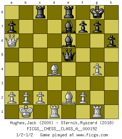 Last move : 1/2-1/2 2018 October 20 14:16:24 [Event "FICGS__CHESS__CLASS_A__000192"] [Site "FICGS"] [Date "2018.08.07"] [Round "1"] [White "Hughes,Jack"] [Black "Sternik,Ryszard"] [Result "1/2-1/2"] [WhiteElo "2000"] [BlackElo "2018"] 1.e4 c5 2.Nf3 d6 3.d4 cxd4 4.Nxd4 Nf6 5.Nc3 e6 6.g4 h6 7.h4 Nc6 8.Rg1 d5 9.exd5 Nxd5 10.Nxd5 exd5 11.Be3 Qxh4 12.Qf3 Be7 13.Qxd5 Nxd4 14.Qxd4 O-O 15.Qe4 Be6 16.O-O-O Rfd8 17.Be2 Rac8 18.Qxb7 Re8 19.Kb1 Qf6 20.Qa6 Qe5 21.Bd4 1/2-1/2 Sicilian : Scheveningen, Keres attack Kingside Castling by player Black (move 14) Queenside Castling by player White (move 16) This chess game ended in a draw. Follow this game move after move (download)Fischer was a master of clarity and a king of artful positioning. His opponents would see where he was going but were powerless to stop him. (Bruce Pandolfini) Frage des Reporters: -Welche besonderen Umstände rechtfertigen das Anhalten der Uhren während einer Turnierpartie? Antwort: -Einen Fotographen zu strangulieren. (Siegbert Tarrasch) La esencia del Ajedrez es pensar acerca de lo que el Ajedrez es. (David Bronstein) Les échecs sont un jeu terrible. Si vous n'avez pas le centre, votre adversaire a une position plus libre. Par contre, si vous avez le centre, alors vous avez vraiment quelque chose pour laquelle vous inquiéter ! (Siegbert Tarrasch) The man who strikes first admits that his ideas have given out. (Chinese proverb)