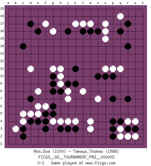 Last move : 0-1 2007 August 27 5:50:44 [Event "FICGS__GO__TOURNAMENT_PRO__000002 "] [Site "FICGS"] [Date "2007.05.16"] [Round "1"] [Black "Mos,Ewa "] [White "Tamayo,Thomas "] [Result "0-1"] [Rating 1 "2100"] [Rating 2 "1988"] 1.q16 r4 2.d17 c4 3.e4 h4 4.d7 e5 5.f5 e6 6.d4 d5 7.c3 c5 8.f3 b3 9.c2 d11 10.c14 o17 11.r14 q18 12.r17 l17 13.p4 m3 14.r3 q3 15.q4 r2 16.s3 s4 17.p3 q2 18.p2 s2 19.k3 m4 20.p7 k4 21.j3 j4 22.h3 f6 23.g5 g4 24.f4 j7 25.g6 e8 26.g8 n7 27.r7 f17 28.e16 g16 29.j9 h9 30.h8 j8 31.g9 h10 32.k9 l8 33.g10 h11 34.k11 g11 35.n10 o11 36.o10 p11 37.p10 q11 38.m16 o15 39.l16 m17 40.n16 o16 41.j16 k17 0-1 This go game has been lost on time (started : 2007.05.16 16:49:44) Here are the names of the openings (joseki) played in the four corners : Corner d4 : c4 e4Komoku (Somok, Xiao~mu`) 3-4 Point. The komoku (3-4) point is the traditional corner enclosure move..Ikken Takagakari (Hankan Nop'dakeolch'im, Yi Gaogua`jiao~, 1-Space High Approach). The 5-4 approach move has become more popular in modern times, as modern Go emphasizes speed and influence. Corner d16 : d17 d11Komoku (Somok, Xiao~mu`) 3-4 Point. The komoku (3-4) point is the traditional corner enclosure move.. Corner q16 : q16 o17Hoshi (Hwajeom, Seongjeom, Xingwei`) 4-4 Point. The star or hoshi (4-4) point, emphasizing influence at the potential expense of territory.Ikken Kakari (Hankan Keolch'im, Yi Gua`jiao~, 1-Space Low Approach). White 2 is the standard approach move to the 4-4. Corner q4 : r4 p4Komoku (Somok, Xiao~mu`) 3-4 Point. The komoku (3-4) point is the traditional corner enclosure move..Ikken Takagakari (Hankan Nop'dakeolch'im, Yi Gaogua`jiao~, 1-Space High Approach). The 5-4 approach move has become more popular in modern times, as modern Go emphasizes speed and influence. Player White won this Go (weiqi, baduk) game.Follow this game move after move (download ) ... {it is} something unearthly... if there are sentient beings on other planets, then they play go. (Emanuel Lasker, chess world champion) Luck never made a man wise. (Seneca, Letters to Lucilius)