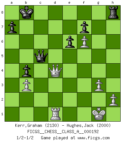 Last move : 1/2-1/2 2019 February 9 0:51:4 [Event "FICGS__CHESS__CLASS_A__000192"] [Site "FICGS"] [Date "2018.08.07"] [Round "1"] [White "Kerr,Graham"] [Black "Hughes,Jack"] [Result "1/2-1/2"] [WhiteElo "2130"] [BlackElo "2000"] 1.d4 d5 2.Nf3 Nf6 3.c4 c6 4.Nc3 e6 5.Bg5 dxc4 6.e4 b5 7.e5 h6 8.Bh4 g5 9.Nxg5 hxg5 10.Bxg5 Nbd7 11.g3 Bb7 12.exf6 Qb6 13.Bg2 O-O-O 14.O-O c5 15.d5 b4 16.Na4 Qb5 17.a3 Nb8 18.axb4 cxb4 19.Qg4 Bxd5 20.Rfc1 Nc6 21.Bxd5 Rxd5 22.Rxc4 Rxg5 23.Qd4 Kb8 24.Rxc6 Rxg3+ 25.fxg3 Qxc6 26.Rd1 Qc7 27.b3 Kc8 28.Qe4 Kb8 29.Qd4 Kc8 30.Qe3 Kb8 31.Qd2 Bc5+ 32.Nxc5 Qxc5+ 33.Qd4 1/2-1/2 Comment by player 1 : Graham Kerr : I've only been here a year too so not entirely familiar either... My instinct was to suggest that you now offer a draw after making your move, but i think that opportunity has now passed. I'll make another offer with my next move... Comment by player 2 : Jack Hughes : Sorry, I'm new to this site and made my move before reading the message. I'm happy to accept the draw here. Jack Hughes Thanks Graham - for understanding and for the game. Graham Kerr gg, thanks ;-) Queen's pawn game Queenside Castling by player Black (move 13) Kingside Castling by player White (move 14) This chess game ended in a draw. Follow this game move after move (download)Before the endgame, the Gods have placed the middle game. (Siegbert Tarrasch) Um dein Spiel zu verbessern musst du zuallererst das Endspiel studieren, denn diese kann unabhängig studiert werden. Die Eröffnung und das Mittelspiel müssen immer in Bezug gesetzt werden zum Endspiel. (José Raúl Capablanca) El Ajedrez lo es todo: arte, ciencia y deporte. (Anatoly Karpov) Tout change constamment, y compris dans le monde des Echecs. (Botvinnik) Perhaps chess is the wrong game for the times (The Chess Master and the Computer, by Garry Kasparov - 2010)