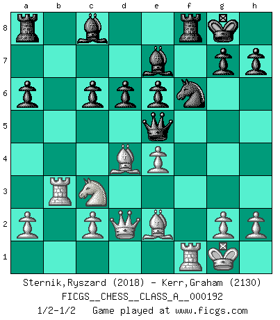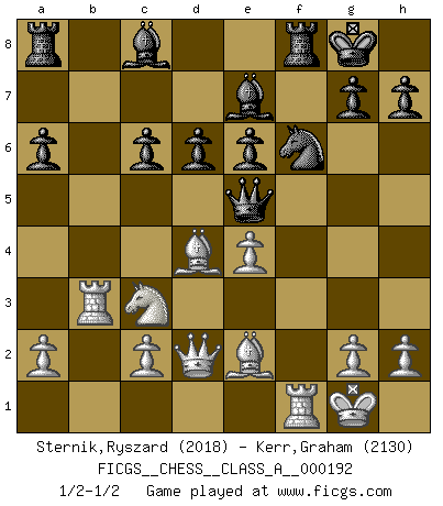 Last move : 1/2-1/2 2018 September 11 17:14:26 [Event "FICGS__CHESS__CLASS_A__000192"] [Site "FICGS"] [Date "2018.08.07"] [Round "1"] [White "Sternik,Ryszard"] [Black "Kerr,Graham"] [Result "1/2-1/2"] [WhiteElo "2018"] [BlackElo "2130"] 1.e4 c5 2.Nf3 d6 3.d4 cxd4 4.Nxd4 Nf6 5.Nc3 a6 6.Bg5 e6 7.f4 Qb6 8.Qd2 Qxb2 9.Rb1 Qa3 10.f5 Nc6 11.fxe6 fxe6 12.Nxc6 bxc6 13.Be2 Be7 14.O-O O-O 15.Rb3 Qc5+ 16.Be3 Qe5 17.Bd4 Qa5 18.Bb6 Qe5 19.Bd4 1/2-1/2 Sicilian : Najdorf, 7...Qb6 Kingside Castling by player White (move 14) Kingside Castling by player Black (move 14) This chess game ended in a draw. Follow this game move after move (download)A big shock; the best chess player in history has passed away. (Lajos Portisch, about Bobby Fischer's death) Ich moechte nie einem Club beitreten, der Leute wie mich als Mitglieder aufnimmt. (Woody Allen) Las piezas de Ajedrez son los bloques del alfabeto que moldean los pensamientos; y esos pensamientos, aunque hagan un diseño visual en el tablero, expresan abstractamente su belleza como un poema. (Marcel Duchamp) Les échecs, c'est la lutte contre l'erreur. (Johannes Zukertort) I believe in luck. How else can you explain the success of those you dislike ? (Jean Cocteau)