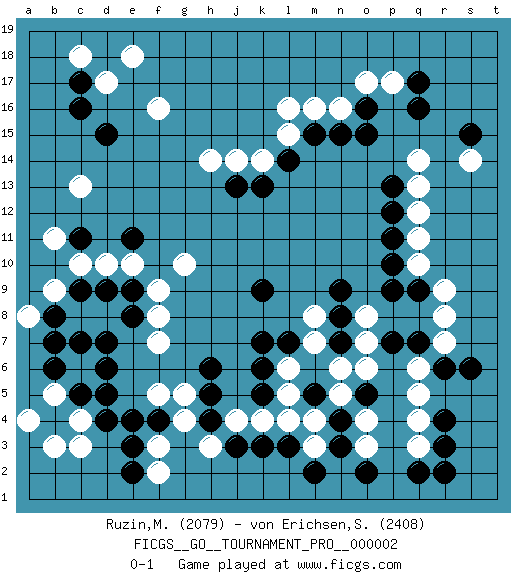 Last move : 0-1 2007 September 11 10:23:33 [Event "FICGS__GO__TOURNAMENT_PRO__000002 "] [Site "FICGS"] [Date "2007.05.16"] [Round "1"] [Black "Ruzin,Mikhail "] [White "von Erichsen,Svante Carl "] [Result "0-1"] [Rating 1 "2079"] [Rating 2 "2408"] 1.q16 d17 2.d4 q4 3.d15 f16 4.c17 c18 5.c16 e18 6.c11 f3 7.d6 k4 8.r6 r8 9.r3 q3 10.r4 q5 11.r2 q6 12.s6 o17 13.q7 r7 14.p7 q10 15.n7 n5 16.n3 o6 17.m5 o7 18.p9 o8 19.q9 r9 20.p10 q11 21.p11 q12 22.p12 q13 23.p13 q14 24.o16 m4 25.n4 m3 26.o5 n6 27.o2 o4 28.q2 l6 29.h4 f5 30.h6 f7 31.k5 l5 32.k6 f9 33.k9 d8 34.e3 f2 35.f4 g4 36.e4 g5 37.h5 h3 38.s15 n16 39.o15 p17 40.q17 s14 41.n15 m16 42.m15 l16 43.e11 l15 44.l14 k14 45.k13 j14 46.j13 h14 47.m2 c3 48.e2 b5 49.b4 c4 50.c5 c6 51.d5 b3 52.b6 a4 53.c7 c8 54.b8 b9 55.c9 a8 56.b7 c10 57.d9 d10 58.e9 e10 59.e8 f8 60.d7 b11 61.l3 l4 62.k3 j4 63.j3 g10 64.k7 c13 65.l7 m7 66.n8 m8 67.n9 o3 0-1 Here are the names of the openings (joseki) played in the four corners : Corner d16 : d17 d15Komoku (Somok, Xiao~mu`) 3-4 Point. The komoku (3-4) point is the traditional corner enclosure move..Ikken Takagakari (Hankan Nop'dakeolch'im, Yi Gaogua`jiao~, 1-Space High Approach). The 5-4 approach move has become more popular in modern times, as modern Go emphasizes speed and influence. Corner d4 : d4 f3Hoshi (Hwajeom, Seongjeom, Xingwei`) 4-4 Point. The star or hoshi (4-4) point, emphasizing influence at the potential expense of territory.Ikken Kakari (Hankan Keolch'im, Yi Gua`jiao~, 1-Space Low Approach). White 2 is the standard approach move to the 4-4. Corner q4 : q4 r6Hoshi (Hwajeom, Seongjeom, Xingwei`) 4-4 Point. The star or hoshi (4-4) point, emphasizing influence at the potential expense of territory.Ikken Kakari (Hankan Keolch'im, Yi Gua`jiao~, 1-Space Low Approach). Black 2 is the standard approach move to the 4-4. Corner q16 : q16 o17Hoshi (Hwajeom, Seongjeom, Xingwei`) 4-4 Point. The star or hoshi (4-4) point, emphasizing influence at the potential expense of territory.Ikken Kakari (Hankan Keolch'im, Yi Gua`jiao~, 1-Space Low Approach). White 2 is the standard approach move to the 4-4. Player White won this Go (weiqi, baduk) game.Follow this game move after move (download ) Avoid the plate connection. (Anonymous) Kids, you tried your best and you failed miserably. The lesson is, never try. (Simpsons)
