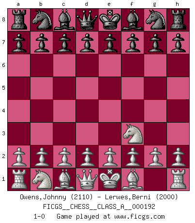 Last move : 1-0 2018 September 17 1:14:39 [Event "FICGS__CHESS__CLASS_A__000192"] [Site "FICGS"] [Date "2018.08.07"] [Round "1"] [White "Owens,Johnny"] [Black "Lerwes,Berni"] [Result "1-0"] [WhiteElo "2110"] [BlackElo "2000"] 1.Nf3 1-0 This chess game has been lost on time (started : 2018.08.07 3:12:34) Reti Opening Player White won this chess game. Follow this game move after move (download)Later, I began to succeed in decisive games. Perhaps because I realized a very simple truth: not only was I worried, but also my opponent. (Mikhail Tal) Es liegt in der Natur, vernüftig zu denken und unlogisch zu handeln. (Anatole France) No hay precio que no valga la pena por la cabellera del Rey enemigo. (Koblentz) Un millionnaire : 'Monsieur Steinitz ! Vous ne participez aux tournois que pour l'argent, alors que moi je n'y viens que pour l'honneur.' Steinitz : 'Chacun joue pour ce qu'il n'a pas'... Beta. Software undergoes beta testing shortly before it's released. Beta is latin for still doesn't work. (Anonymous)