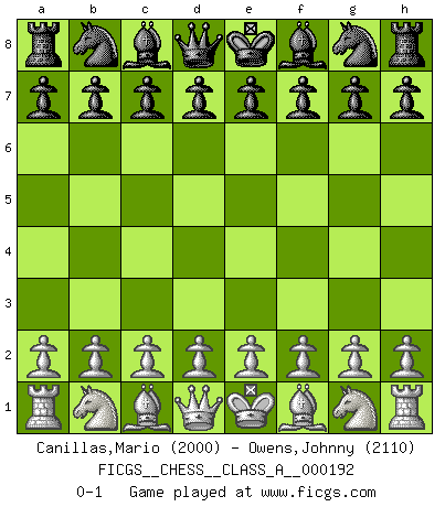 Last move : 0-1 2018 September 16 13:15:15 [Event "FICGS__CHESS__CLASS_A__000192"] [Site "FICGS"] [Date "2018.08.07"] [Round "1"] [White "Canillas,Mario"] [Black "Owens,Johnny"] [Result "0-1"] [WhiteElo "2000"] [BlackElo "2110"] 0-1 This chess game has been lost on time (started : 2018.08.07 3:12:34) Player Black won this chess game. Follow this game move after move (download)Methodical thinking is of more use in Chess than inspiration. (C. J. S. Purdy) Bogoljubow: Matt in vier Zügen! Tartakower: Ich verbitte mir jede Belästigung! (Savielly Grigorievitsch Tartakower) En partidas rápidas, el Caballo es mas poderoso que el Alfil. (Vlastimil Hort) On croit qu'il y a plus de mauvais joueurs que de bons joueurs, c'est faux : Il y a autant de joueurs qui gagnent que de joueurs qui perdent. (Philippe Geluck) If you know the enemy and know yourself you need not fear the results of a hundred battles. (Sun Tzu)