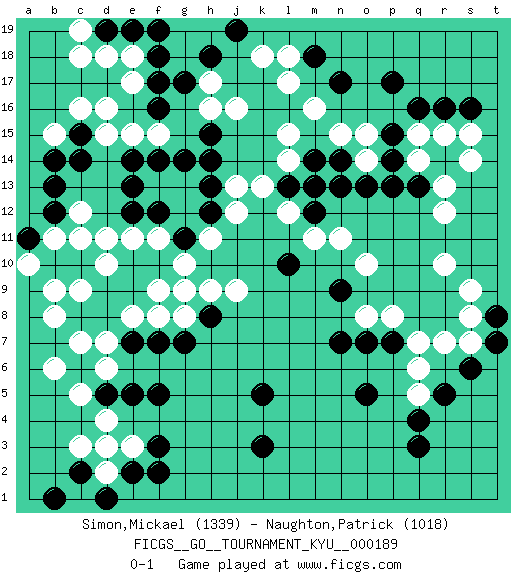 Last move : 0-1 2018 September 28 21:37:40 [Event "FICGS__GO__TOURNAMENT_KYU__000189"] [Site "FICGS"] [Date "2018.08.07"] [Round "1"] [Black "Simon,Mickael"] [White "Naughton,Patrick"] [Result "0-1"] [Rating 1 "1339"] [Rating 2 "1018"] 1.r16 d16 2.q3 d4 3.p17 r10 4.r5 r13 5.k3 d7 6.c14 c16 7.f16 c12 8.e14 e17 9.f17 l17 10.f3 d3 11.f5 h17 12.h15 l15 13.e12 d10 14.k5 r7 15.p13 o10 16.p7 q6 17.o5 q5 18.q4 q7 19.r14 p8 20.q13 r12 21.o7 o8 22.n7 j16 23.f18 e18 24.b14 b15 25.d5 c5 26.c6 d6 27.e5 b6 28.f10 l12 29.n9 n11 30.d9 c9 31.c8 c7 32.c10 b9 33.d8 b8 34.b10 d11 35.b12 b11 36.a11 c11 37.b13 a10 38.l10 j12 39.h13 j13 40.n17 g8 41.f7 e8 42.e9 f9 43.e10 f8 44.e7 j9 45.h8 h9 46.g7 g9 47.s6 s7 48.e2 d2 49.j19 e11 50.g11 g12 51.h12 h11 52.f12 g13 53.h14 f11 54.e19 d18 55.d19 c19 56.f19 c18 57.n13 o14 58.o13 n15 59.g14 f13 60.e13 g10 61.h18 k18 62.g17 m16 63.m18 m13 64.m14 l14 65.n14 o15 66.m12 m11 67.l13 k13 68.m13 q14 69.p14 q15 70.p15 r15 71.q16 s15 72.s16 s14 73.t7 s8 74.t8 s9 75.d1 e3 76.f2 l18 77.c2 c3 78.b1 f15 79.f14 e15 80.g11 h16 81.c15 d15 0-1 Here are the names of the openings (joseki) played in the four corners : Corner d16 : d16 c14 Hoshi (Hwajeom, Seongjeom, Xingwei`) 4-4 Point. The star or hoshi (4-4) point, emphasizing influence at the potential expense of territory. Ikken Kakari (Hankan Keolch'im, Yi Gua`jiao~, 1-Space Low Approach). Black 2 is the standard approach move to the 4-4. Player White won this Go (weiqi, baduk) game. Follow this game move after move (download)One big eye kills one small eye. (Anonymous) When the going gets tactical, the computers get going. (Hyatt)