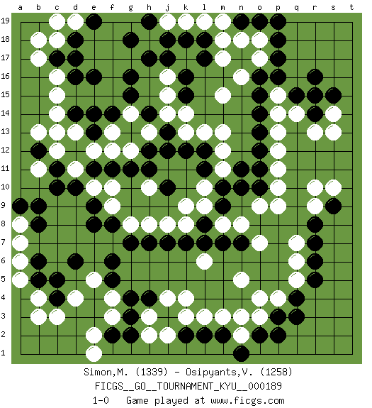 Last move : 1-0 2018 November 13 9:50:3 [Event "FICGS__GO__TOURNAMENT_KYU__000189"] [Site "FICGS"] [Date "2018.08.07"] [Round "1"] [Black "Simon,Mickael"] [White "Osipyants,Vladimir"] [Result "1-0"] [Rating 1 "1339"] [Rating 2 "1258"] 1.r16 d4 2.q3 c16 3.p17 r10 4.r5 k4 5.e16 c13 6.d14 c14 7.c17 b17 8.d16 c15 9.d18 c18 10.d17 b18 11.j17 r13 12.d6 f4 13.c4 c3 14.c5 b3 15.c10 d13 16.e14 m17 17.k15 m15 18.e13 d11 19.d10 e10 20.e9 f10 21.e11 e12 22.f11 f12 23.g11 g12 24.h11 f9 25.e8 g8 26.g7 h8 27.h7 j8 28.j7 k8 29.k7 n3 30.l8 l9 31.m9 l10 32.m7 k13 33.h12 h13 34.k12 l13 35.r8 p9 36.l12 m12 37.j13 j14 38.j12 g14 39.m10 m13 40.l11 m11 41.f8 h10 42.j10 k9 43.g16 a6 44.b6 a5 45.r14 q14 46.q15 s14 47.r15 p14 48.h4 h3 49.j3 j4 50.g3 h2 51.g4 f3 52.g2 j2 53.f2 e2 54.f5 e5 55.f6 e1 56.s15 s13 57.o10 p10 58.o11 p11 59.o12 p12 60.o13 o9 61.n11 n5 62.b8 a8 63.a9 a7 64.b9 b4 65.b5 q6 66.r6 q5 67.q4 p4 68.p3 o4 69.b12 b13 70.l18 m18 71.s9 s10 72.o14 j15 73.k16 k14 74.l17 o18 75.p18 o17 76.o16 p15 77.p16 n16 78.o15 p13 79.g15 j16 80.h17 l6 81.l7 q7 82.r7 n8 83.n7 o7 84.o2 m8 85.n10 r9 86.m2 m3 87.l2 l3 88.k2 k3 89.n19 m19 90.o19 n18 91.p19 l19 92.j18 j19 93.h19 k19 94.k18 d19 95.e19 c19 96.g18 n2 97.n1 o3 98.p2 b11 99.c11 c12 100.d12 f13 101.f14 d11 102.h14 1-0 Here are the names of the openings (joseki) played in the four corners : Corner d16 : c16 e16 Komoku (Somok, Xiao~mu`) 3-4 Point. The komoku (3-4) point is the traditional corner enclosure move.. Ikken Takagakari (Hankan Nop'dakeolch'im, Yi Gaogua`jiao~, 1-Space High Approach). The 5-4 approach move has become more popular in modern times, as modern Go emphasizes speed and influence. Corner d4 : d4 d6 Hoshi (Hwajeom, Seongjeom, Xingwei`) 4-4 Point. The star or hoshi (4-4) point, emphasizing influence at the potential expense of territory. Ikken Takagakari (Hankan Nop'dakeolch'im, Yi Gaojia, 1-Space High Approach). White typically responds at 6-4 or 3-10. White 4-10 is played when White finds play on the right side advantageous. White 4-8 or 3-8 may be played when White has support at top. Player Black won this Go (weiqi, baduk) game. Follow this game move after move (download)The enemy's vital point is your own. (Anonymous) A generalist learns less and less about more and more until he knows nothing about everything. (Author unknown)