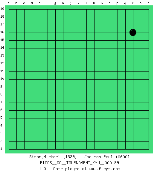 Last move : 1-0 2018 September 6 23:49:56 [Event "FICGS__GO__TOURNAMENT_KYU__000189"] [Site "FICGS"] [Date "2018.08.07"] [Round "1"] [Black "Simon,Mickael"] [White "Jackson,Paul"] [Result "1-0"] [Rating 1 "1339"] [Rating 2 "0600"] 1.r16 1-0 This go game has been lost on time (started : 2018.08.07 16:41:1) Here are the names of the openings (joseki) played in the four corners : Player Black won this Go (weiqi, baduk) game. Follow this game move after move (download)Don't count territory held by only one eye. (Anonymous) You have to believe in yourself. (Sun Tzu)