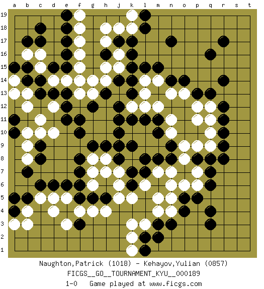 Last move : 1-0 2019 January 25 20:8:51 [Event "FICGS__GO__TOURNAMENT_KYU__000189"] [Site "FICGS"] [Date "2018.08.07"] [Round "1"] [Black "Naughton,Patrick"] [White "Kehayov,Yulian"] [Result "1-0"] [Rating 1 "1018"] [Rating 2 "0857"] 1.q16 d4 2.q4 c16 3.e16 d10 4.k16 k10 5.n3 q10 6.r8 k3 7.r12 p11 8.h9 h8 9.g9 g8 10.f8 g7 11.f10 g10 12.f11 g11 13.g12 h10 14.j10 h11 15.j11 h12 16.h13 j9 17.j12 n4 18.o4 m4 19.f7 g6 20.f6 f16 21.e15 f17 22.e17 f18 23.e18 j16 24.j17 h17 25.h16 j15 26.k17 h15 27.n17 o6 28.f3 f4 29.g5 g4 30.h5 h4 31.c6 c5 32.d6 d5 33.c13 c11 34.c9 b13 35.b14 b12 36.c14 b9 37.c8 b8 38.b7 c10 39.n14 n11 40.j8 j7 41.k9 k8 42.j9 h7 43.k7 j6 44.k6 j5 45.l8 k5 46.f5 l10 47.m6 m5 48.m3 l3 49.q3 m7 50.m8 n6 51.n8 e3 52.p8 l13 53.k14 l14 54.k15 n13 55.o14 o13 56.p13 p12 57.q13 o9 58.q6 l6 59.l15 m14 60.m15 a13 61.a4 b3 62.b5 b4 63.a5 a3 64.a11 b10 65.a10 d12 66.e11 a14 67.b15 d14 68.d15 c15 69.d13 b16 70.a15 e14 71.e13 f14 72.c18 f15 73.c17 h18 74.b17 f13 75.e12 j18 76.r17 k18 77.l18 k19 78.l19 k12 79.r10 q9 80.r9 p9 81.q8 o8 82.o5 p6 83.p5 p7 84.q7 q11 85.r11 n7 86.m10 m9 87.n9 l9 88.m11 m12 89.k11 l12 90.l11 n10 91.l2 k2 92.m2 k1 93.l1 q12 94.r14 e5 95.e6 f19 96.e19 g14 97.k13 h14 98.j14 g13 99.l7 n5 100.pass 1-0 Here are the names of the openings (joseki) played in the four corners : Corner d16 : c16 e16 Komoku (Somok, Xiao~mu`) 3-4 Point. The komoku (3-4) point is the traditional corner enclosure move.. Ikken Takagakari (Hankan Nop'dakeolch'im, Yi Gaogua`jiao~, 1-Space High Approach). The 5-4 approach move has become more popular in modern times, as modern Go emphasizes speed and influence. Corner d4 : d4 h9 Hoshi (Hwajeom, Seongjeom, Xingwei`) 4-4 Point. The star or hoshi (4-4) point, emphasizing influence at the potential expense of territory. Player Black won this Go (weiqi, baduk) game. Follow this game move after move (download)In an unreasonable situation, an unreasonable move is reasonable. (Tamino) A good teacher is like a candle - it consumes itself to light the way for others. (Author unknown)