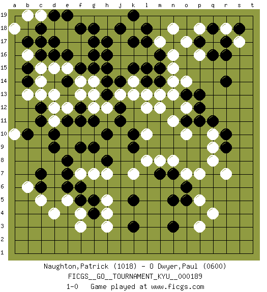 Last move : 1-0 2018 August 26 21:46:50 [Event "FICGS__GO__TOURNAMENT_KYU__000189"] [Site "FICGS"] [Date "2018.08.07"] [Round "1"] [Black "Naughton,Patrick"] [White "O Dwyer,Paul"] [Result "1-0"] [Rating 1 "1018"] [Rating 2 "0600"] 1.q16 q4 2.d16 d4 3.c6 c5 4.d9 o17 5.r14 q17 6.r17 r18 7.r10 r7 8.g17 c15 9.c16 d15 10.c12 c13 11.k3 h3 12.n3 p3 13.n5 o7 14.k5 o10 15.p11 s17 16.r16 h5 17.g4 h4 18.f5 f3 19.l17 o14 20.l14 f13 21.f15 f14 22.g15 b6 23.c7 h7 24.e6 k7 25.m7 m8 26.n7 n8 27.o6 p7 28.k10 l12 29.j12 j13 30.h13 k13 31.h14 h12 32.h10 g12 33.f9 g10 34.g9 f10 35.h8 f7 36.e7 l10 37.k9 l8 38.o11 n11 39.n12 m13 40.m14 n13 41.p13 m12 42.e11 e10 43.d10 e9 44.e8 e12 45.g11 d11 46.f11 e5 47.f6 g7 48.c11 d12 49.f12 g13 50.j11 j15 51.j14 k14 52.k15 k16 53.l15 l16 54.m16 j17 55.k17 j16 56.n17 n15 57.m15 k18 58.l18 f16 59.g16 f17 60.f18 e17 61.d17 g14 62.h15 e18 63.g18 d18 64.c18 b16 65.e16 e15 66.c17 n18 67.j18 n16 68.h17 m17 69.k19 o12 70.p12 l13 71.h16 q9 72.r9 q8 73.o13 n14 74.q18 p18 75.p17 p16 76.s18 f4 77.g5 q10 78.q11 p5 79.o5 b19 80.d19 c19 81.e19 a18 82.b14 b13 83.b15 c14 84.b17 a10 85.b10 d13 86.e14 1-0 Here are the names of the openings (joseki) played in the four corners : Corner d4 : d4 c6 Hoshi (Hwajeom, Seongjeom, Xingwei`) 4-4 Point. The star or hoshi (4-4) point, emphasizing influence at the potential expense of territory. Ikken Kakari (Hankan Keolch'im, Yi Gua`jiao~, 1-Space Low Approach). Black 2 is the standard approach move to the 4-4. Corner q16 : q16 o17 Hoshi (Hwajeom, Seongjeom, Xingwei`) 4-4 Point. The star or hoshi (4-4) point, emphasizing influence at the potential expense of territory. Ikken Kakari (Hankan Keolch'im, Yi Gua`jiao~, 1-Space Low Approach). White 2 is the standard approach move to the 4-4. Player Black won this Go (weiqi, baduk) game. Follow this game move after move (download)Those who are good at winning, don't usually fight. (Zhang) Difficult things take a long time, impossible things a little longer. (Author unknown)