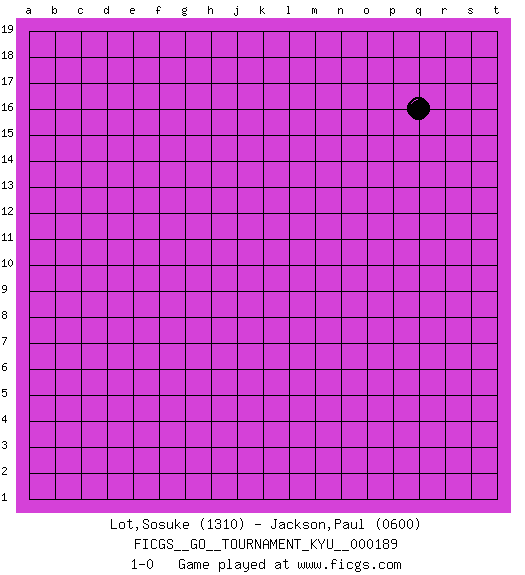 Last move : 1-0 2018 September 6 23:49:56 [Event "FICGS__GO__TOURNAMENT_KYU__000189"] [Site "FICGS"] [Date "2018.08.07"] [Round "1"] [Black "Lot,Sosuke"] [White "Jackson,Paul"] [Result "1-0"] [Rating 1 "1310"] [Rating 2 "0600"] 1.q16 1-0 This go game has been lost on time (started : 2018.08.07 16:41:1) Here are the names of the openings (joseki) played in the four corners : Player Black won this Go (weiqi, baduk) game. Follow this game move after move (download)The poor player plays the opponent's game for him. (Anonymous) Two beer, or not two beer. (Unknown)