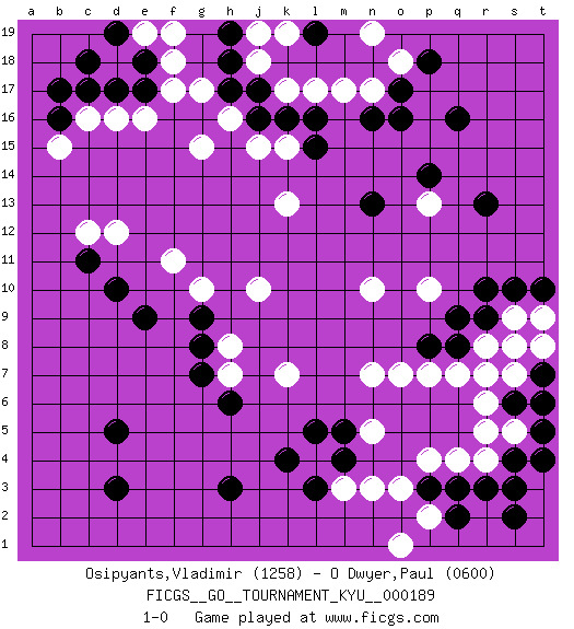 Last move : 1-0 2018 August 26 21:54:51 [Event "FICGS__GO__TOURNAMENT_KYU__000189"] [Site "FICGS"] [Date "2018.08.07"] [Round "1"] [Black "Osipyants,Vladimir"] [White "O Dwyer,Paul"] [Result "1-0"] [Rating 1 "1258"] [Rating 2 "0600"] 1.q16 q4 2.d3 d16 3.d5 n3 4.r10 r7 5.k4 g17 6.d10 d12 7.o16 k17 8.r13 n17 9.o17 o18 10.p18 n19 11.n16 m17 12.n13 n7 13.h3 k13 14.g9 n10 15.q8 q7 16.r3 r4 17.q3 p4 18.p3 o3 19.s4 s5 20.s3 k7 21.h6 h7 22.g7 h8 23.g8 j10 24.c17 c16 25.d17 e16 26.e17 f17 27.b16 b15 28.b17 s9 29.r9 r8 30.p8 o7 31.s10 t8 32.t10 t9 33.t7 s8 34.t5 s7 35.s6 r5 36.t4 r6 37.t6 p10 38.q9 p7 39.m5 l4 40.l5 n5 41.l3 m3 42.m4 p2 43.q2 o1 44.s2 p13 45.p14 g10 46.e9 f11 47.c11 c12 48.l15 k15 49.l16 l17 50.k16 j15 51.j16 g15 52.j17 j18 53.h18 k19 54.h17 h16 55.h19 f18 56.e18 e19 57.d19 f19 58.c18 j19 59.l19 1-0 Here are the names of the openings (joseki) played in the four corners : Player Black won this Go (weiqi, baduk) game. Follow this game move after move (download)Don't make empty triangles. (Anonymous) Empty your mind, be formless, shapeless — like water. (Bruce Lee)