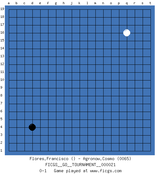 Last move : 0-1 2018 September 9 12:11:31 [Event "FICGS__GO__TOURNAMENT__000021"] [Site "FICGS"] [Date "2018.08.08"] [Round "1"] [Black "Flores,Francisco"] [White "Agronow,Cosmo"] [Result "0-1"] [Rating 2 "0065"] 1.d4 q16 0-1 This go game has been lost on time (started : 2018.08.08 22:53:22) Here are the names of the openings (joseki) played in the four corners : Player White won this Go (weiqi, baduk) game. Follow this game move after move (download)While the Baroque rules of chess could only have been created by humans, the rules of go are so elegant, organic, and rigorously logical that if intelligent life forms exist elsewhere in the universe, they almost certainly play go. (Edward Lasker, international chess master) To send light into the darkness of men's hearts - such is the duty of the artist. (Schumann)